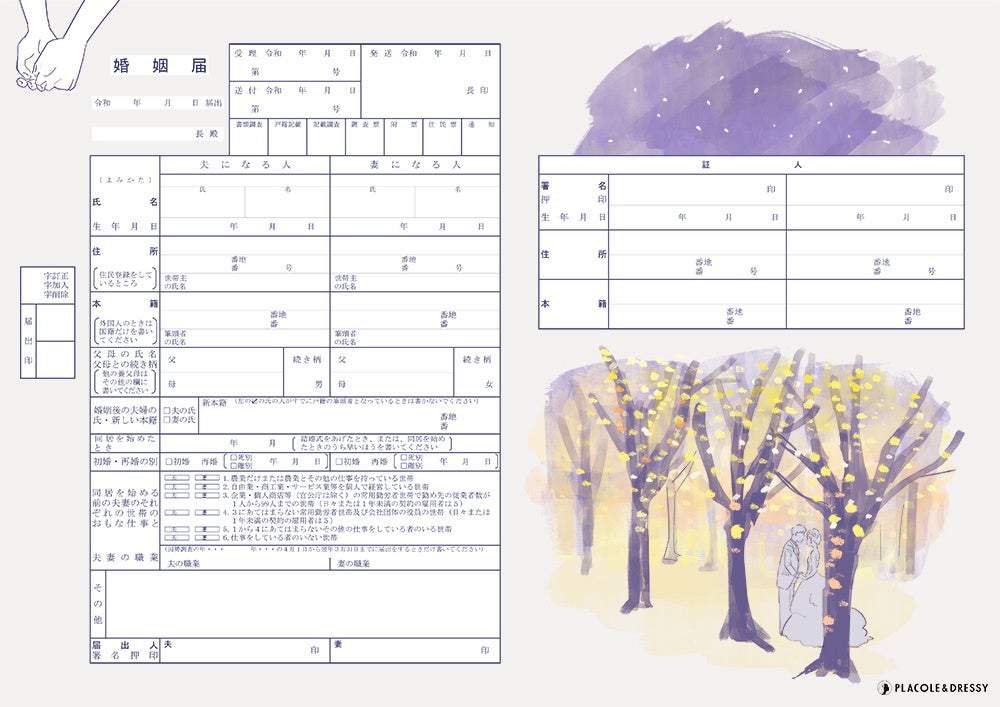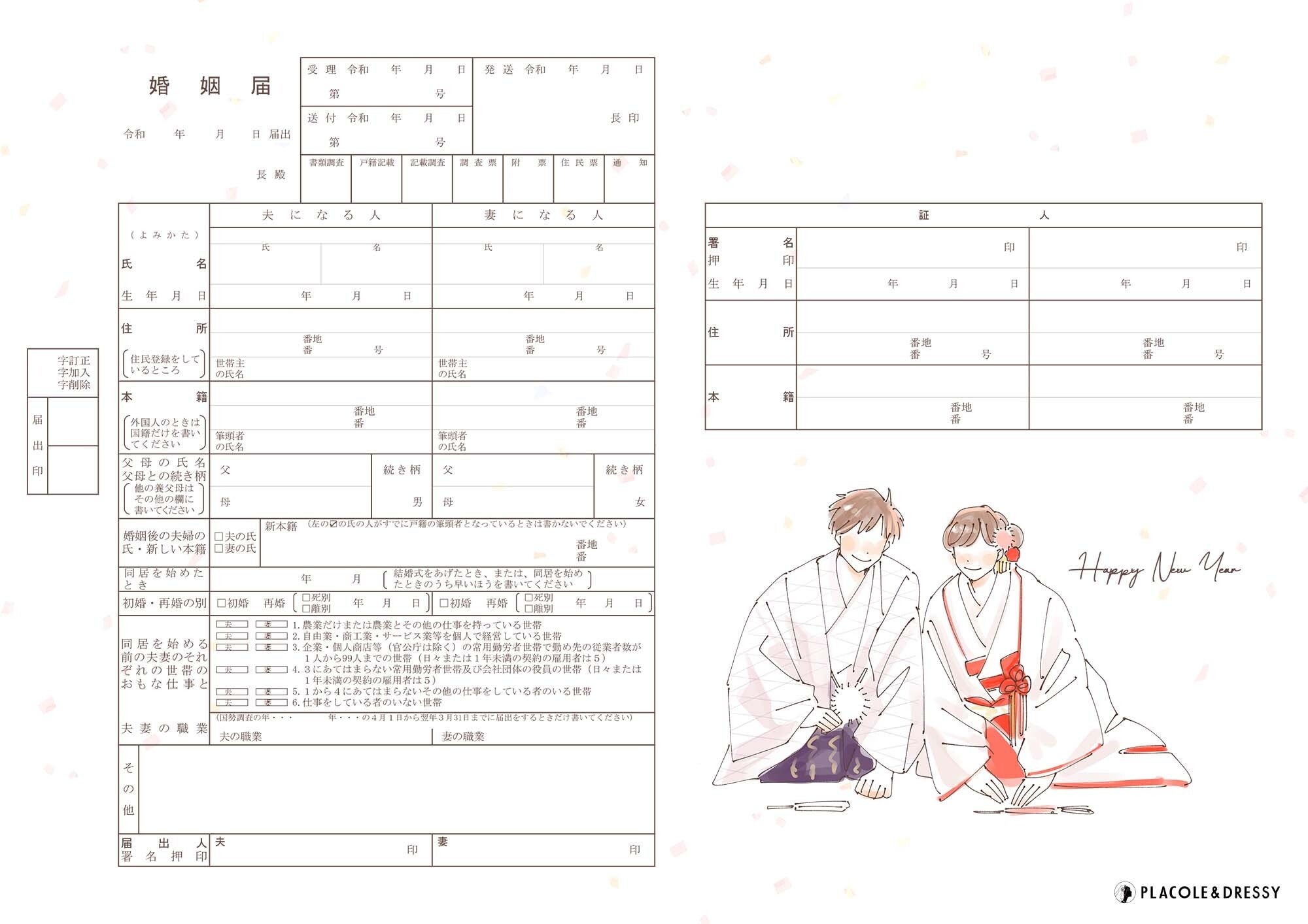この度、多くの方からお声をいただき、『PLACOLE & DRESSY婚姻届』第16段では新年・兎年モチーフの婚姻届など、お正月ならではの婚姻届を発表。9月よりリリースした地域限定デザインの大分県・宮崎県ver.も登場、オリジナル婚姻届を描き下ろしでお届けいたします。