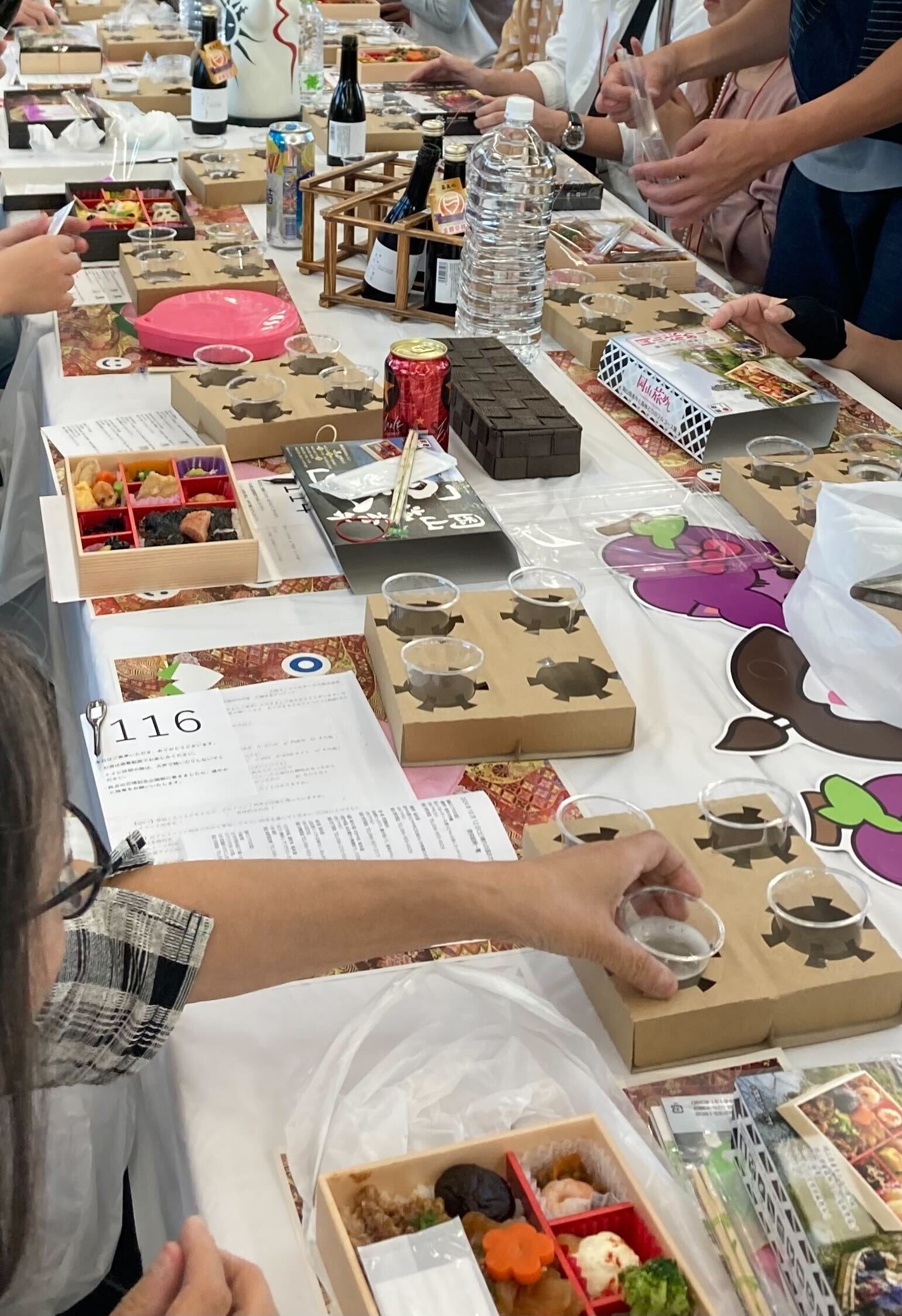今回は「十八盛 純米大吟醸(十八盛酒造)」、「しゅわしゅわ 発泡性清酒(嘉美心酒造)」、「櫻芳烈 ひやおろし 純米吟醸原酒(芳烈酒造)」、「三冠 朝日 純米吟醸火入れ(三冠酒造)」をはじめ10種類以上の岡山地酒と、「桃太郎の祭りずし」、「岡山後楽園のお弁当」、「岡山旅めし」、「岡山海苔弁 黒」の4種類のお弁当を用意。130名の乗客の皆さまには、郷土料理のままかり酢漬けや鰆、岡山若のり、黒鯛、きび団子など、岡山ならではの食材や郷土料理と岡山地酒を味わいながら、1時間45分の「日本酒列車 晴れの国おかやま」を楽しんでいただきました。