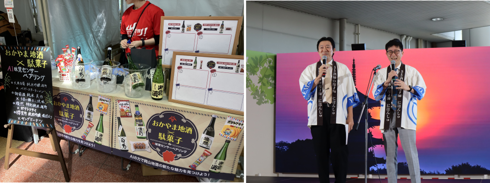 本イベントでは、岡山県への観光誘客を促進するため、大阪モノレール 万博記念公園駅のコンコース内で岡山県の特産品を販売し関西圏の方に岡山の味を楽しんでいただくほか、東京・新橋にあるアンテナショップ「とっとり・おかやま新橋館」で10月14日(月・祝)まで提供していた「おかやま地酒×駄菓子 AI味覚センサーペアリング」を実施。ステージではきき酒師の漫才師「にほんしゅ」によるペアリングの解説や日本酒を題材とした漫才を披露しました。