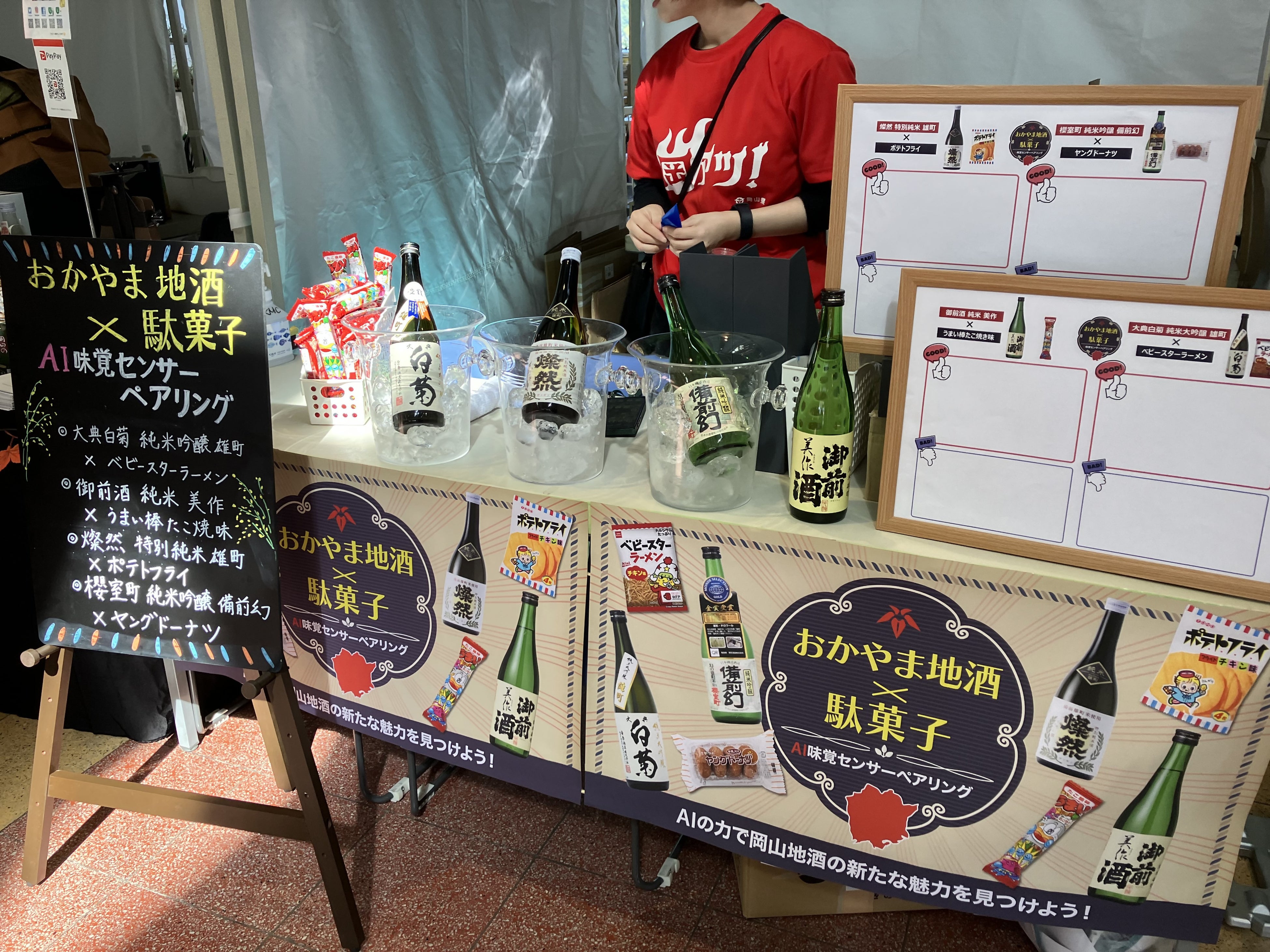 コンコース内のブースで行った「おかやま地酒×駄菓子 AI味覚センサーペアリング」では、東京・新橋のアンテナショップ「とっとり・おかやま新橋館」で提供していた、おかやま地酒と駄菓子のペアリング体験メニュー(※)の中から4種を提供。