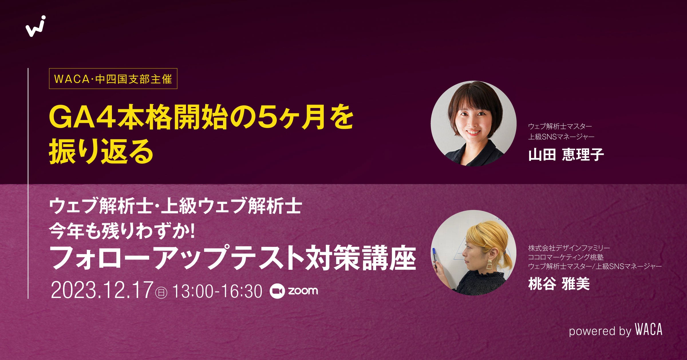 2023/12/17(日)13:00-16:30 GA4本格開始の5カ月を振り返る&フォローアップテスト対策講座【WACA中四国支部主催】