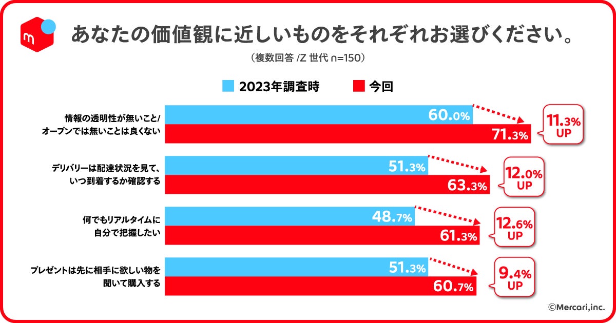Z世代の価値観を聞いたところ、「何でもリアルタイムに自分で把握したい」と回答した人は、前回調査時から12.6%増えて61.3%という結果に。また、「デリバリーは配達状況を見て、いつ到着するか確認する」と回答した人は、前回調査時から12.0%増えて61.3%となり、さまざまなライフシーンで状況をすぐに把握し可視化させたい意向が強まっている結果がみられました。