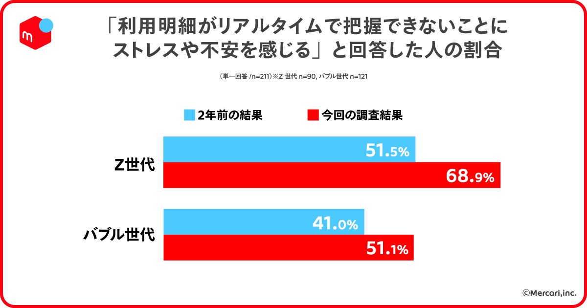 また、利用明細がリアルタイムに把握できないことについて、ストレスや不安を感じるという回答は、2年前の結果(Z世代51.5%:バブル世代41.0%)に比べて、今回の調査結果(Z世代68.9%:バブル世代51.1%)の方が高い数字が出ており、利用明細をリアルタイムで把握することのニーズが高まっている傾向がみられます。