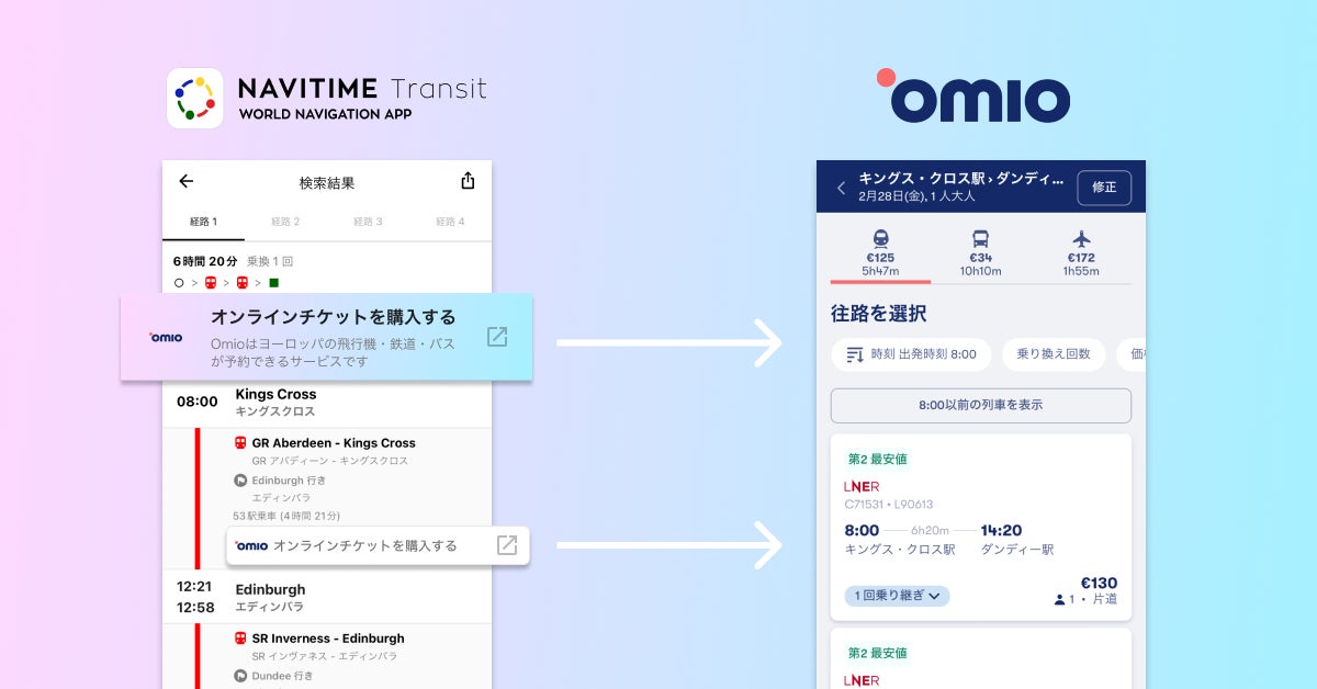 Omio Corp.,(代表:Naren Shaam、本社:ドイツ ベルリン)と、株式会社ナビタイムジャパン(代表取締役社長:大西 啓介、本社:東京都港区)は、2025年3月5日(水)より、ヨーロッパの交通比較検索サービス『Omio(オミオ)』と、ナビタイムジャパンの世界の路線図・乗換案内サービス『NAVITIME Transit』の連携を開始し、乗換検索からイギリス、イタリア、スペインの鉄道チケットの予約・購入が可能になります。