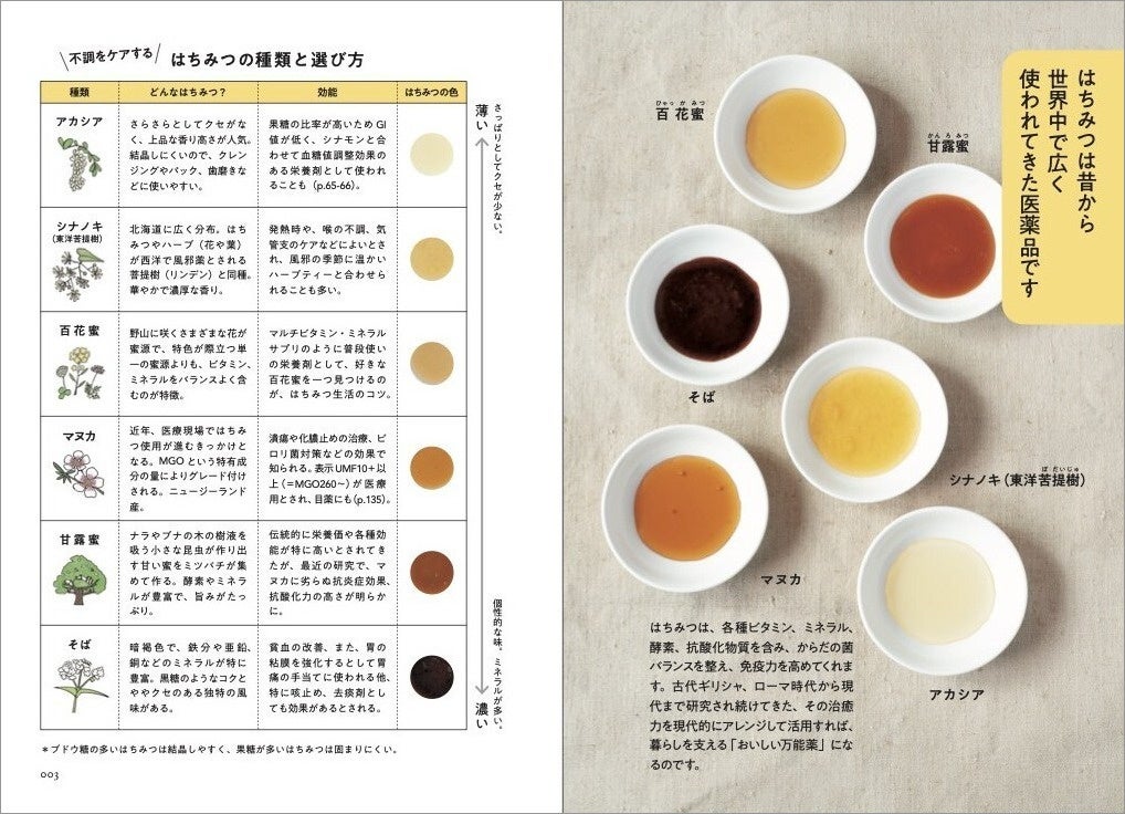 本書は巻頭のカラー16ページで、はちみつの選び方や使い方のコツがビジュアルでよくわかる「おいしいおうち薬局の作り方」を収録。どんなはちみつをどう選べばいいかがよくわかります。