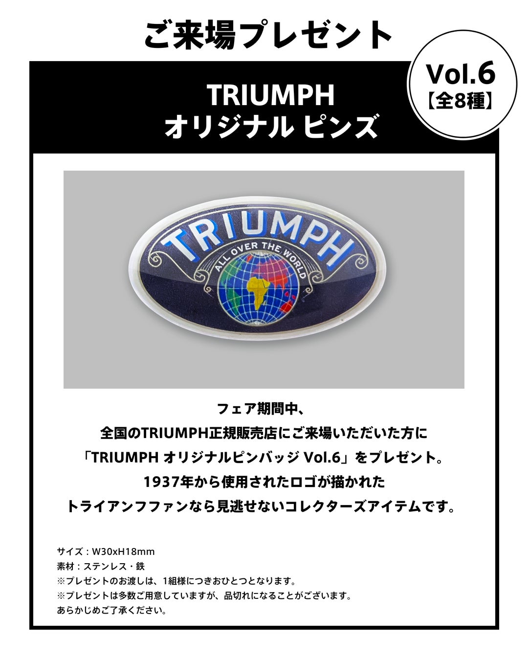 期間中、全国のTRIUMPH正規販売店にご来場いただいた方に、「TRIUMPH オリジナル ピンズ Vol.6」をプレゼントいたします。