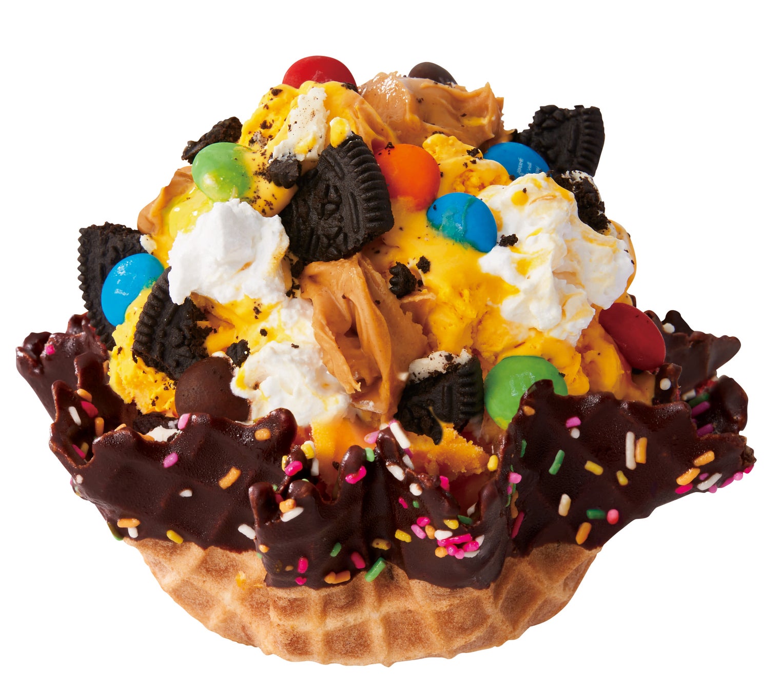 お菓子をくれなきゃいたずらしちゃうぞ!!とハロウィンをイメージし、エムアンドエムズ®やココアクッキーなどたくさんのお菓子がトッピングされた期間限定のアイスクリーム。パンプキンアイスクリームの甘さにピーナッツバターの塩味がアクセント!カップを、カラースプレー付のハッピーチョコワッフルボール(別売り)にするとさらにかわいい華やかなアイスクリームに仕上がります。