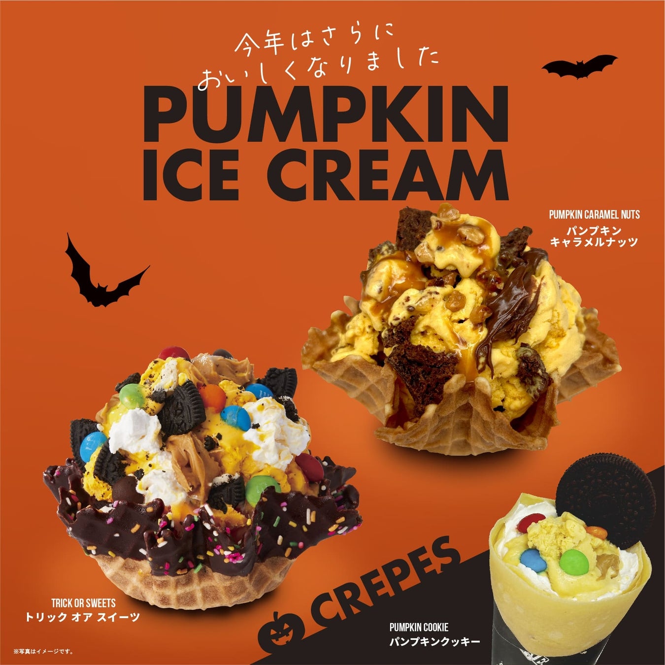 また、もちもち食感が人気のクレープに『トッリク オア スイーツ』をまるごと包みこんだクレープも同時販売いたします。かぼちゃスイーツの美味しさを追求し、かぼちゃマニアの方にもご満足いただける濃厚なアイスクリーム商品です。