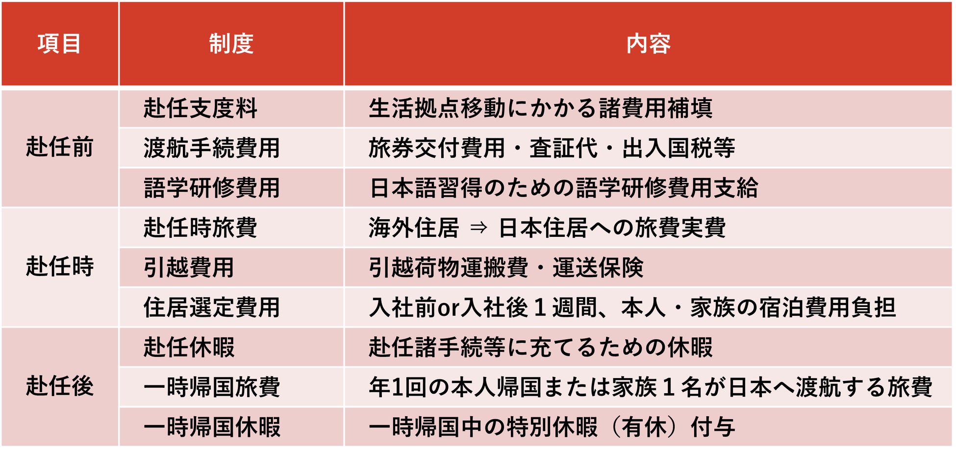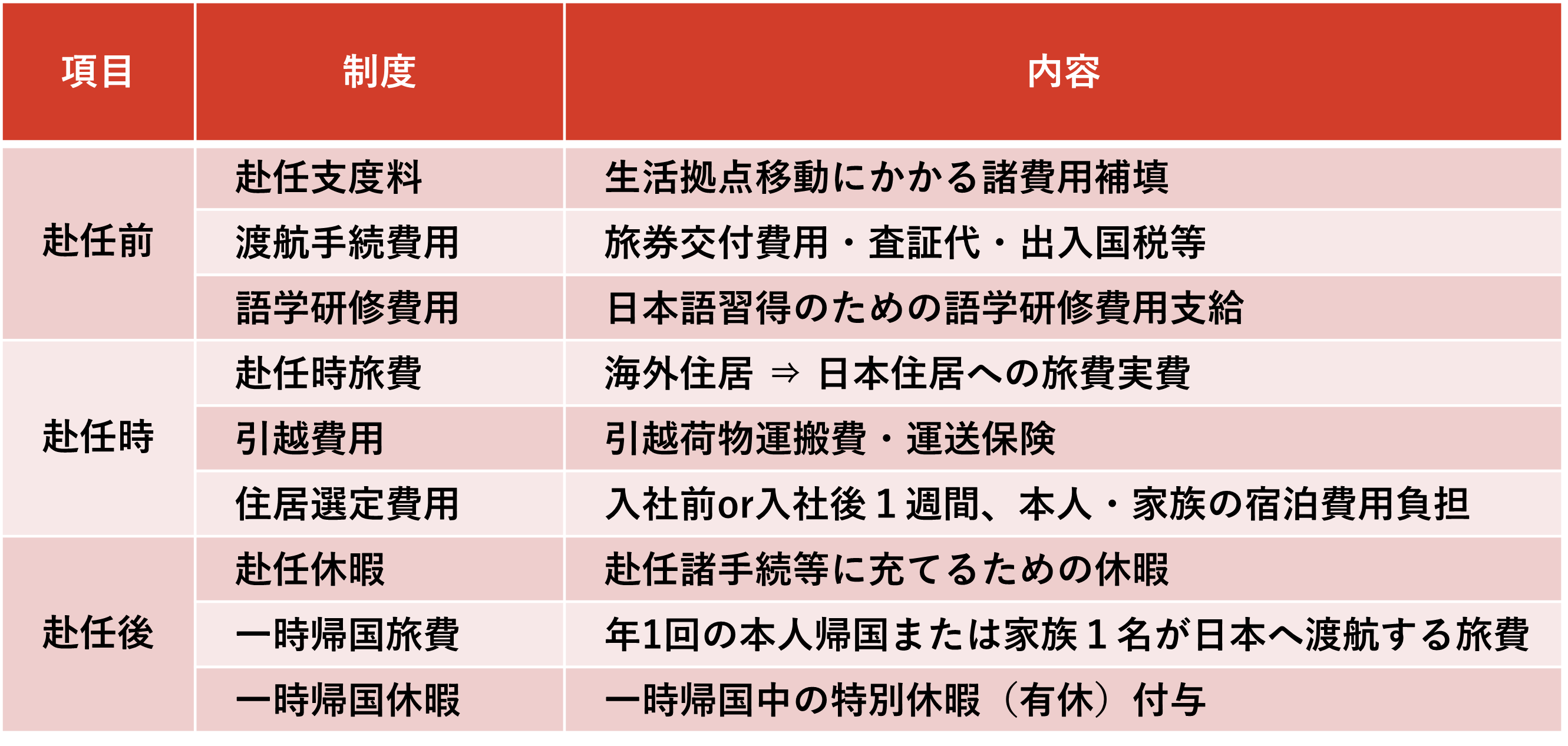 当社では、高度専門人財獲得のために国内のみならず海外での採用強化を図っています。「海外採用者日本勤務制度」では、赴任前、赴任時、赴任後のすべてのフェーズでの支援をします。海外で採用後の日本渡航にかかる諸費用(旅券・引越・渡航など)はもちろん、日本で住居を選定する際は本人に加えて家族の渡航費用・宿泊費用や、入社後に本人が一時帰国または家族が日本へ渡航する費用も支給します。さらに、赴任後の諸手続のための休暇や、一時帰国の際の特別休暇を付与します。