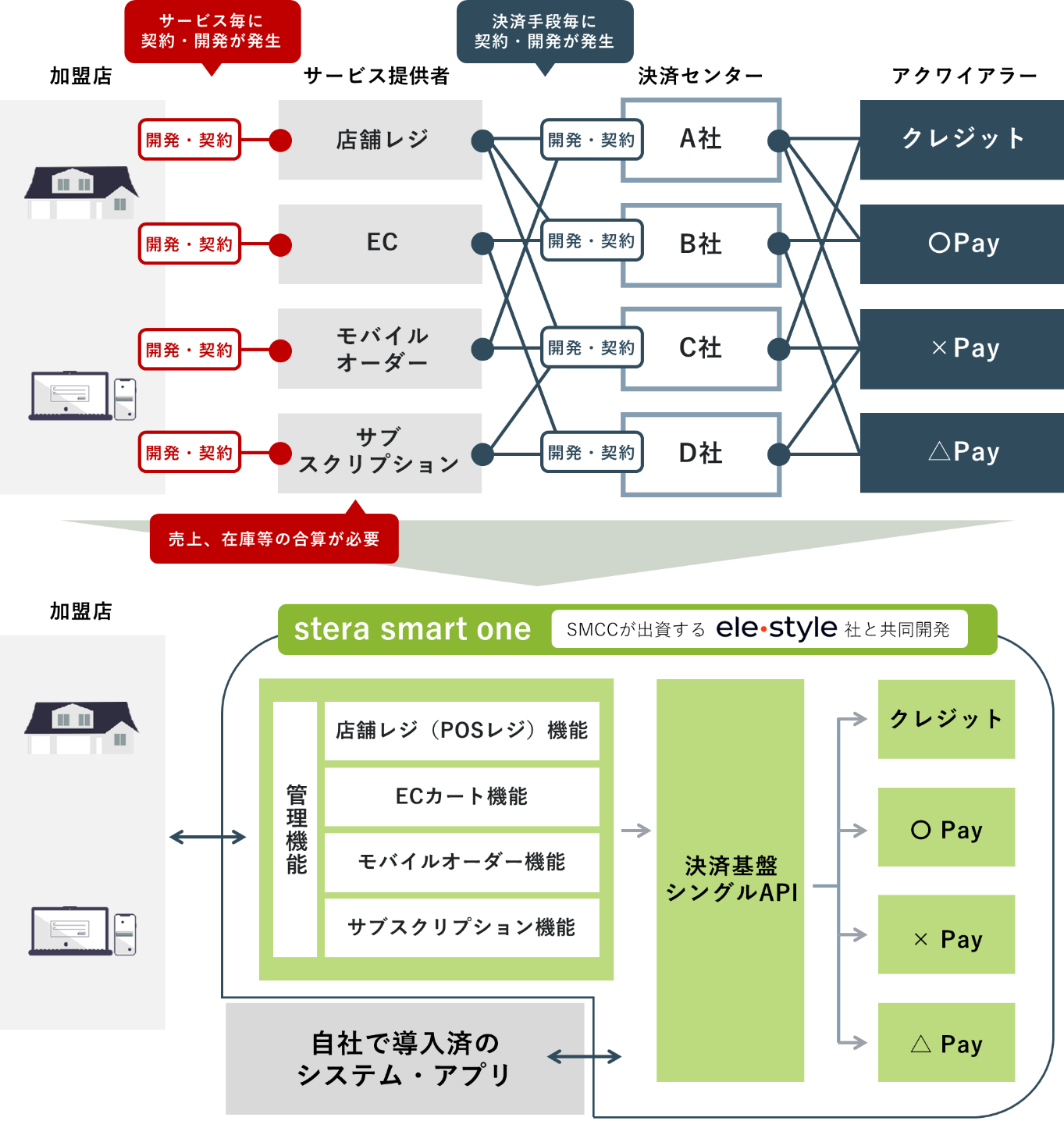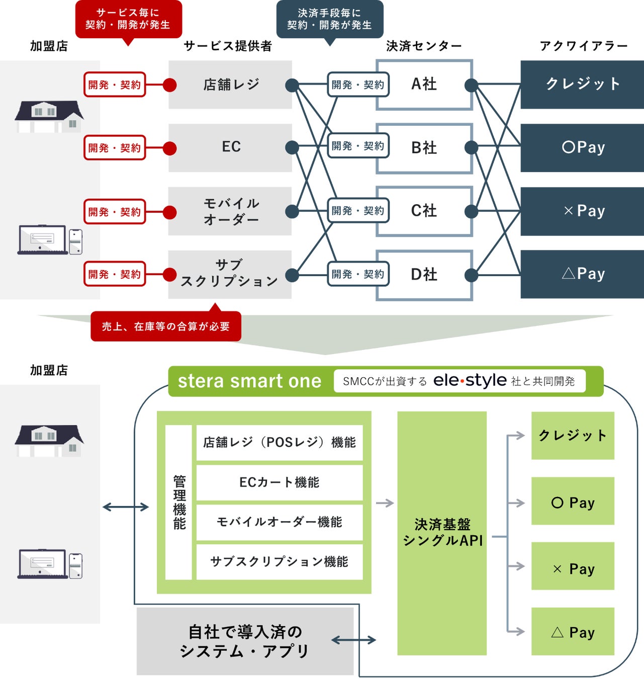 キャッシュレス化の進展や事業者における業種・販売方式の多様化に伴い、事業者のデジタルトランスフォーメンション化(以下、DX化)はますます重要となっております。このような環境変化の中、キャッシュレス決済のリーディングカンパニーである三井住友カードと、マルチモバイル決済プラットフォーム「elepay」とモバイルアプリケーションSaaS「OneQR」のDXソリューションを提供するELESTYLEは、決済×周辺サービスをワンストップで 提供し事業者のDX化・キャッシュレス化をサポートすることを目的に、steraシリーズの新サービス「stera smart one」をリリースします。