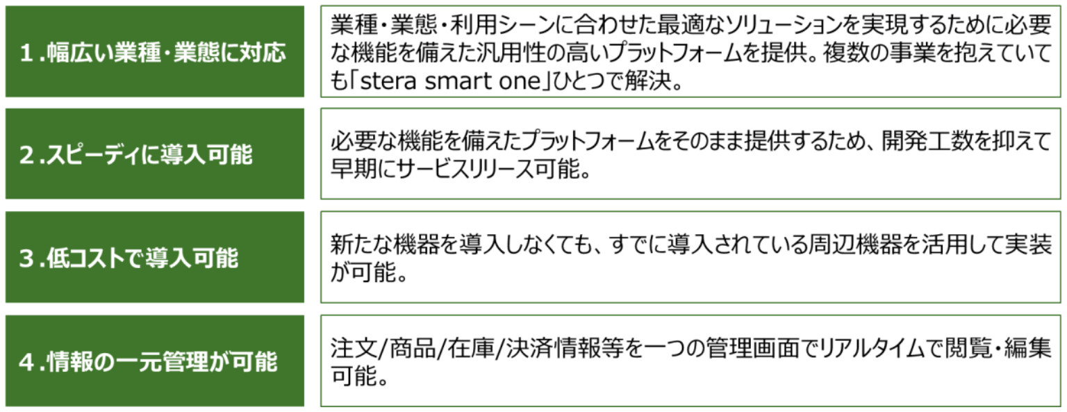 「stera smart one」は、事業者の様々な課題を解決するSaaS型ソリューションです。あらゆる業態・業種のビジネス課題に対する汎用性の高いプラットフォームで、事業者のビジネスの特徴や課題に合わせたソリューションを必要な機能・仕組みとともに提供し、キャッシュレス化、業務効率化、省人化、顧客満足度の向上を実現します。