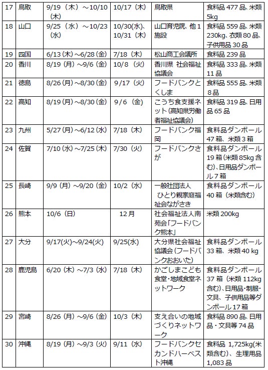 現在フードドライブの取り組みは全30支店にまで拡大しており、また、10月16日の「世界食料デー」、10月30日の「食品ロス削減の日」等10月の食品ロス削減月間を捉えた7月~10月期を強化期間と設定し、NTT西日本グループ一体で地域の実状にあわせ、各NPO等へ寄贈させていただきました。寄贈品については寄贈先を通じ、各地域における支援品を必要とする方にお届けし、有効に活用していただきます。
