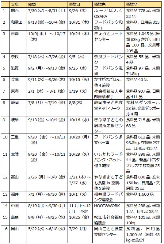 また、各支店ではフードドライブだけでなく、災害時等での利用を想定した備蓄品の寄贈や日用品(文具・衣類・子供用品・生活用品)の寄贈等を含め、地域社会への支援を続けております。