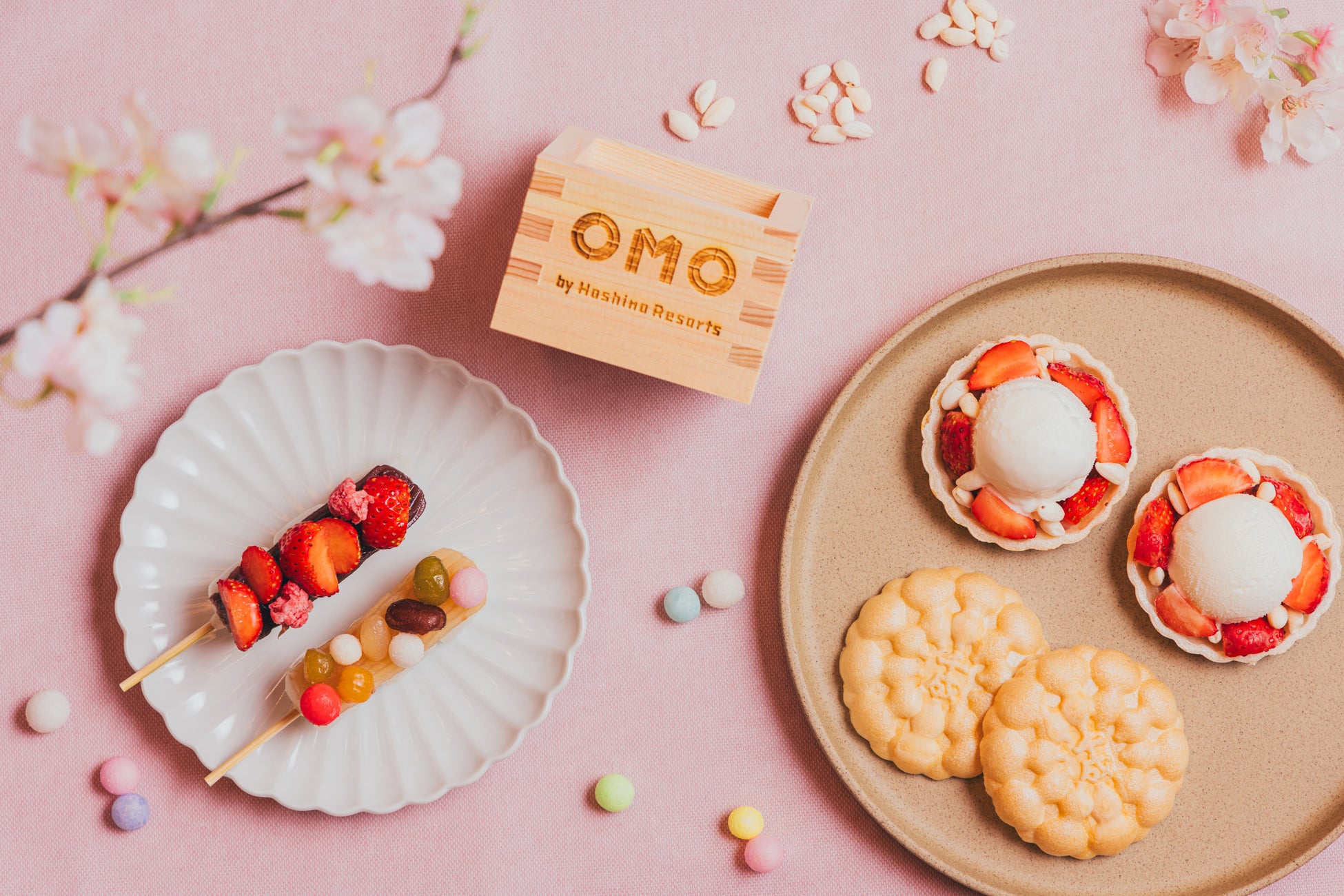 桜を眺めながらOMOオリジナル和菓子を楽しめます。和菓子は2種類で、大塚にある老舗和菓子屋「千成もなか本舗」の食材を使用したOMO5東京大塚限定メニューです。一つは、「千成もなか本舗」のこし餡と白餡をのせたお団子です。お花見団子をイメージして苺やおいり(*)、甘納豆を組み合わせて春らしく仕上げました。もう一つは「千成もなか本舗」の「さくさく最中」に、桜餡と苺、甘酒アイスをのせています。桜餡の風味で季節感が感じられる最中です。