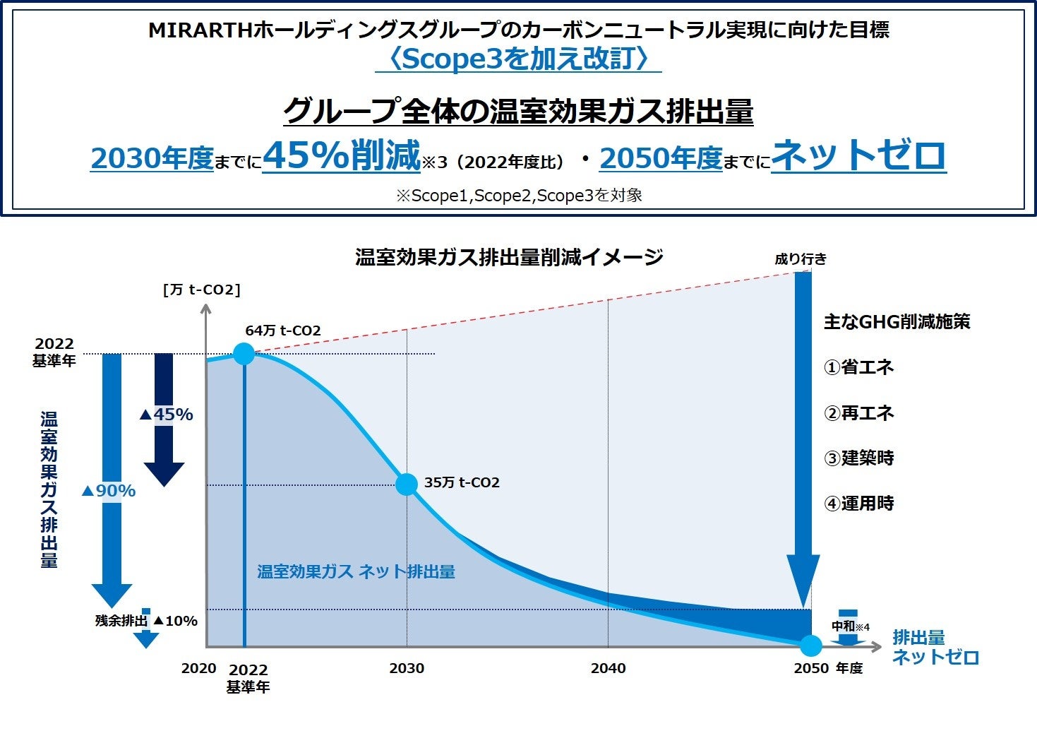 2050年のカーボンニュートラル実現に向け、MIRARTHホールディングスグループの事業活動に伴う温室効果ガス排出量(Scope1、2及び3※2)については、2030年度までに45%削減(2022年度比)、2050年度までにネットゼロとする目標に改訂いたしました。