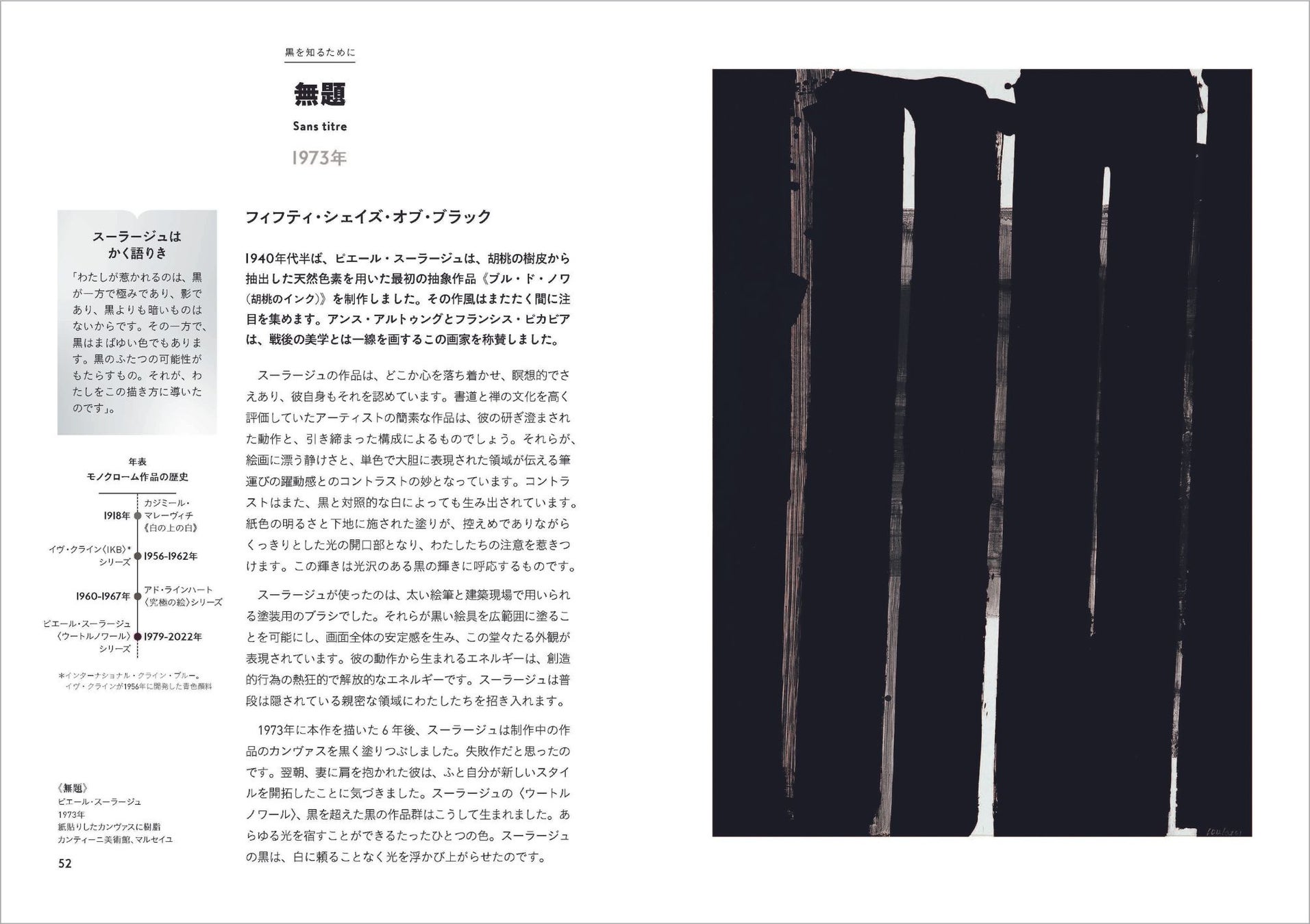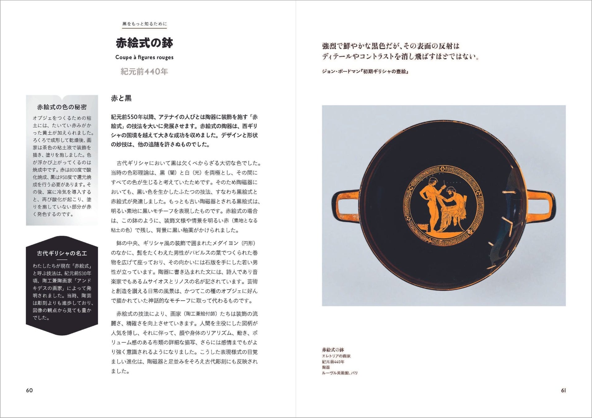 アートの中の黒/黒の世界地図/黒の科学/完璧な黒を求めて/ナルキッソス(カラヴァッジオ)/女性の肖像(レンブラント)/マドリード、1808年5月3日(ゴヤ)/画家の母の肖像(ホイッスラー)/すみれの花束をつけたベルト・モリゾ(マネ)/ゲルニカ(ピカソ)/Number 26 A, Black and White(ポロック)/青い目の女(モディリアーニ)/黒と白(マン・レイ)/Detail Drawing(キース・ヘリング)ほか