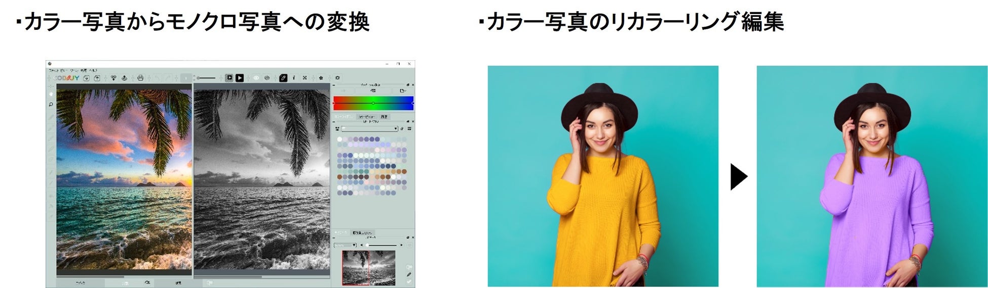 「CODIJY (コディジ)」シリーズは、写真の色を自在に変更できる写真着色ソフトです。モノクロ写真に色をつけたり、カラー写真をモノクロにしたりできます。また、カラー写真のリカラーリング編集もできます。