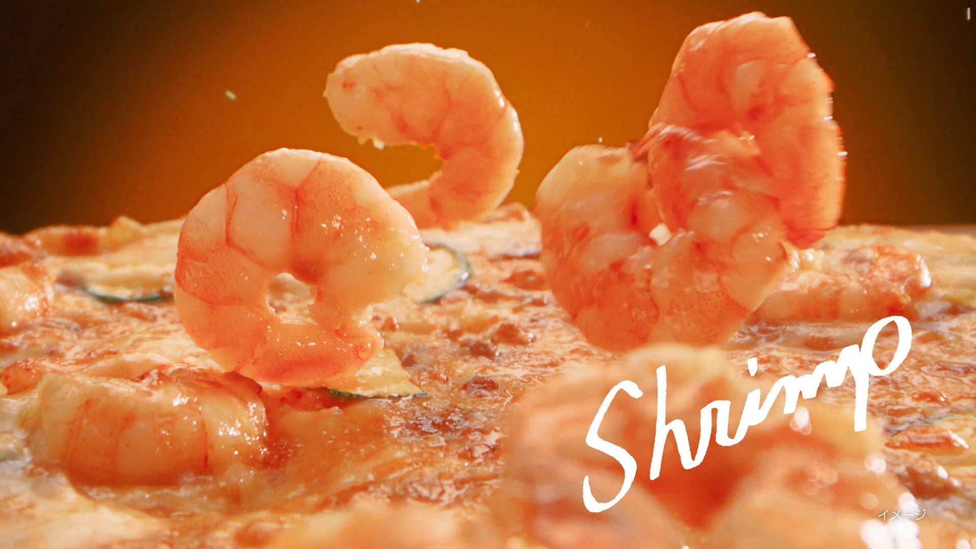 今度はお父さんも参加して、親子3人が海の見えるウッドデッキで踊ります。熟成パンチェッタ&瀬戸内レモンソースの爽やかさと、ぷりぷりの大海老のガーリックシュリンプの映像で、バリエーション豊富なクォーターピザを表現しています。