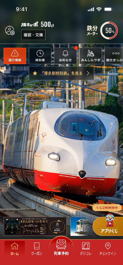 2016年3月にリリース。JR九州インターネット列車予約の機能をメインに、列車位置情報の提供や起動するだけでスタンプやJRキューポがもらえるなどお得に楽しめる機能を搭載。2024年3月末時点のダウンロード数は約220万件。