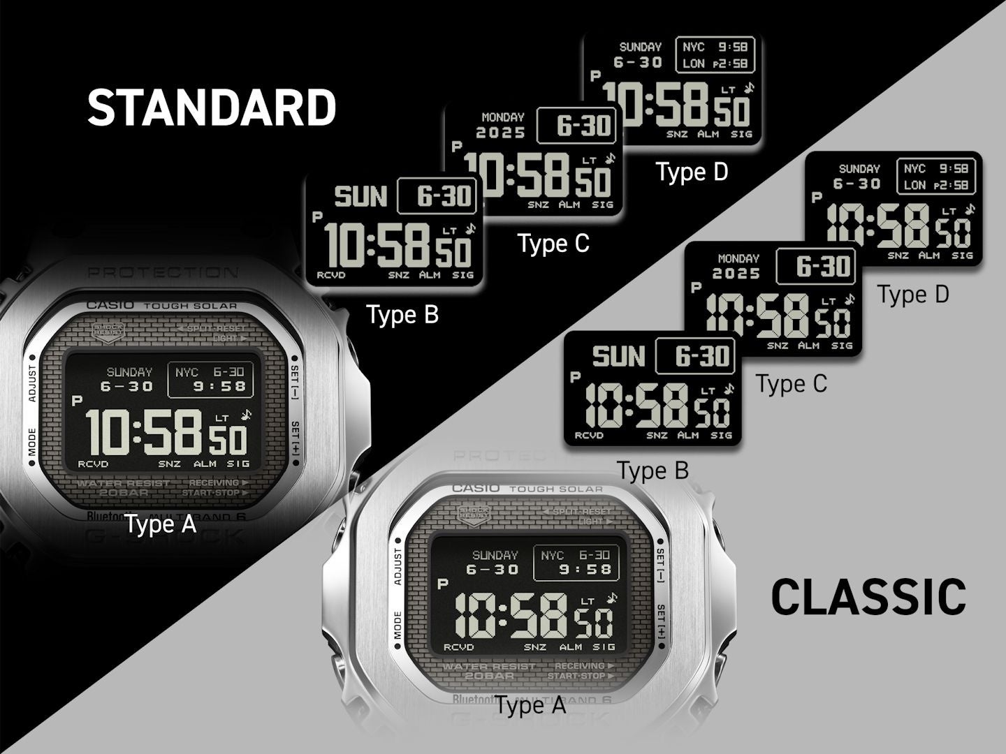 高精細なMIP液晶は、数字や文字を自在にレイアウトできることから、フェイス表現の自由度に貢献しています。日付・曜日表示や二都市の時刻表示など、4種類のフェイスデザインをボタン操作で切り替えられます。スマートフォンとの連携により、アプリ上で2種類のフォントを用意し、標準フォント「STANDARD」に加えて初代“G-SHOCK”から続く7セグメント表示のフォント「CLASSIC」にも対応するなど、好みに合わせた時間表示を選択できます。