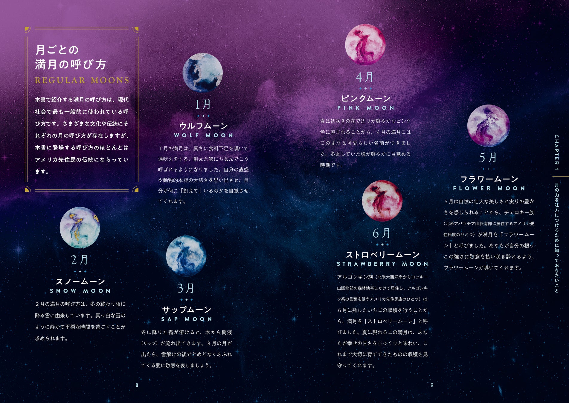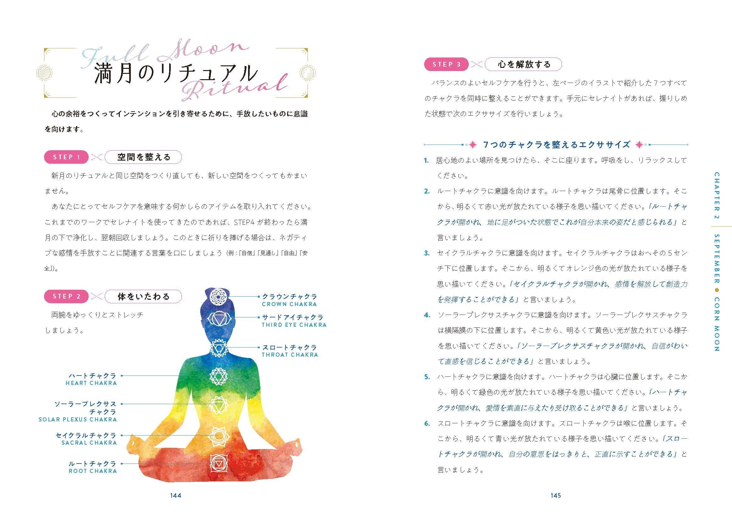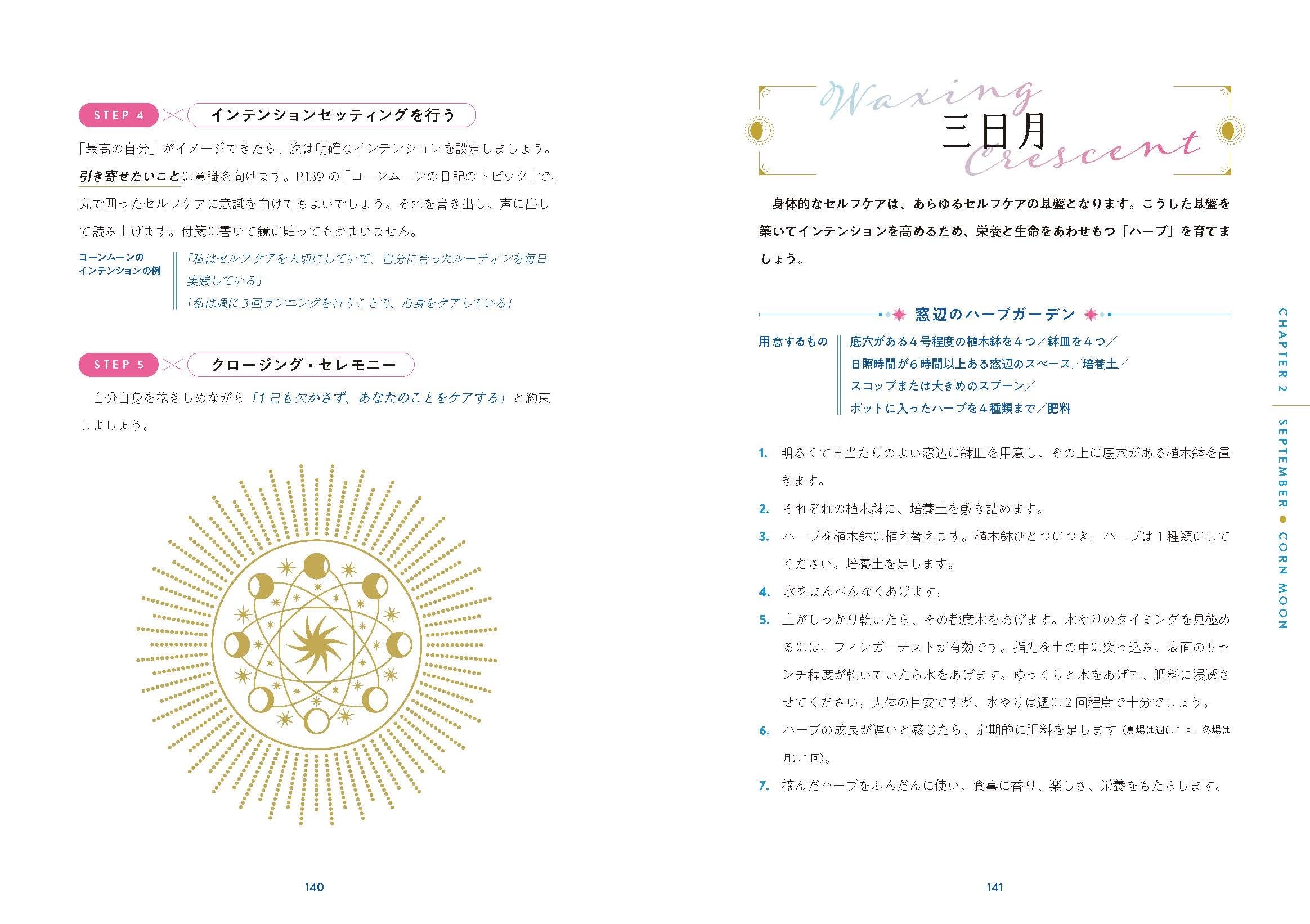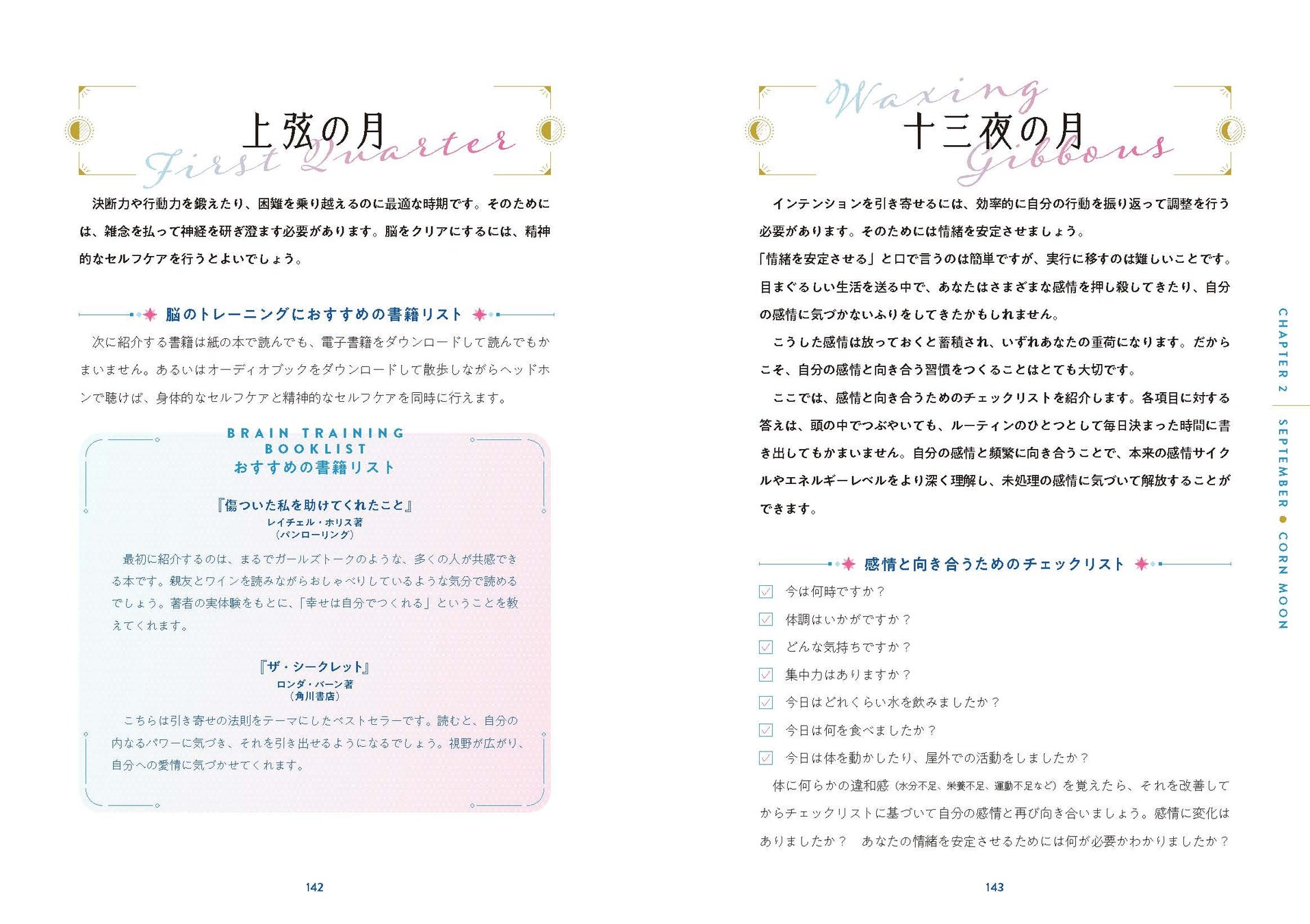 新月、三日月 、上弦の月、十三夜月、満月、居待月 、下弦の月 、有明月の8つのフェーズに沿った心と体と魂のセルフケアを紹介。