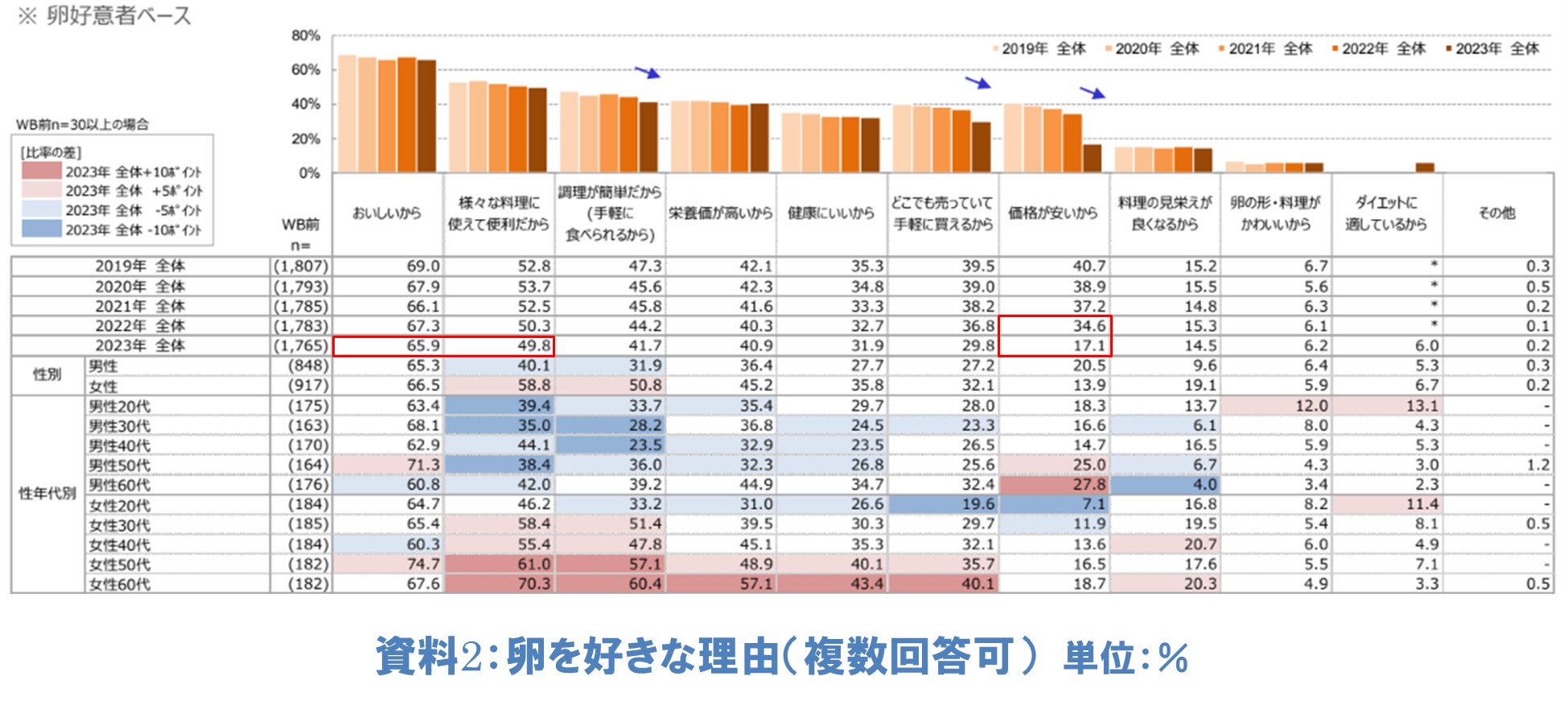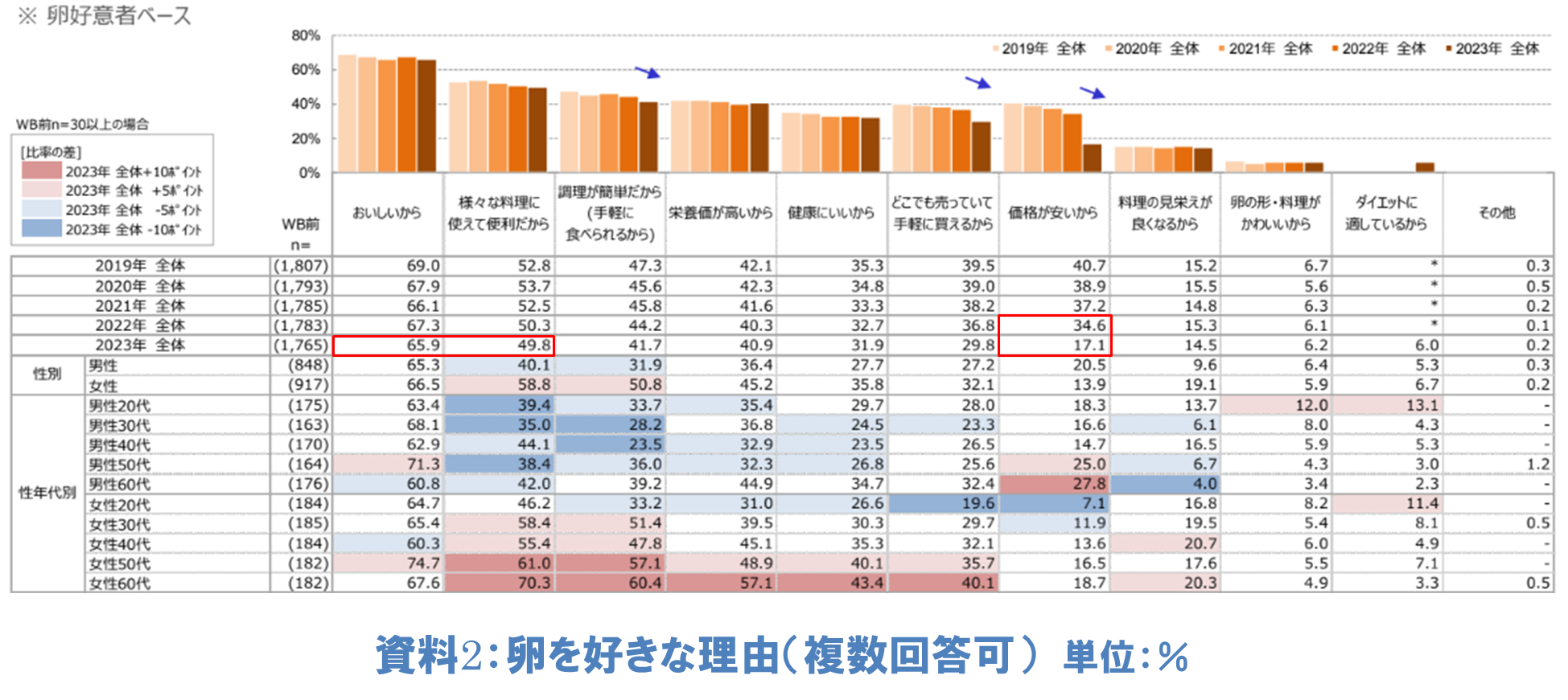 今まで、購入しやすく価格が安定していた卵の印象が、飼料価格の高騰や鳥インフルエンザの影響で安定供給が難しく価格が上昇したことが、生活者の「卵を好きな理由」の変化に影響している様子がうかがえます(資料2)。