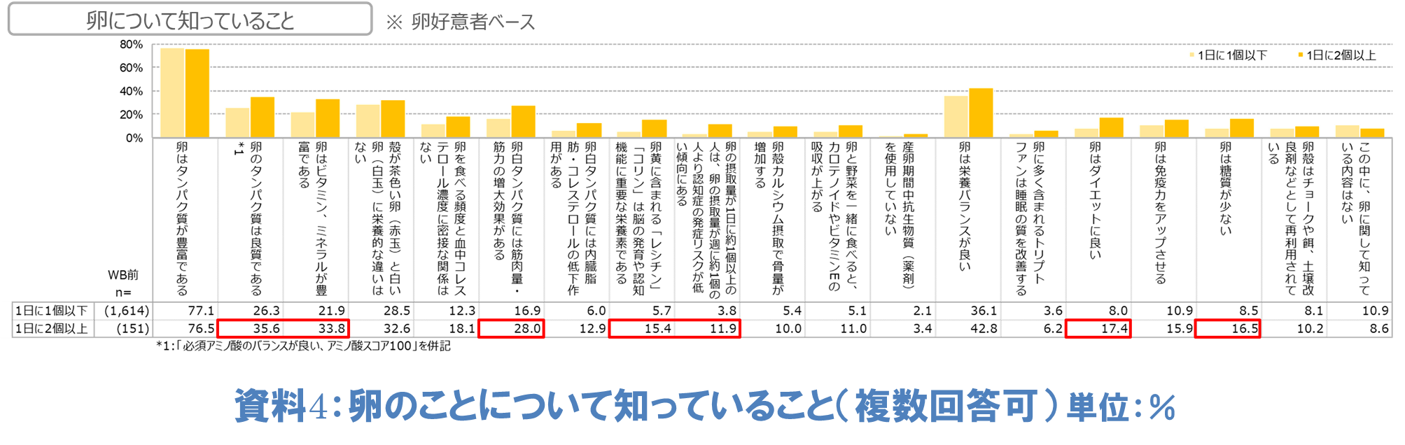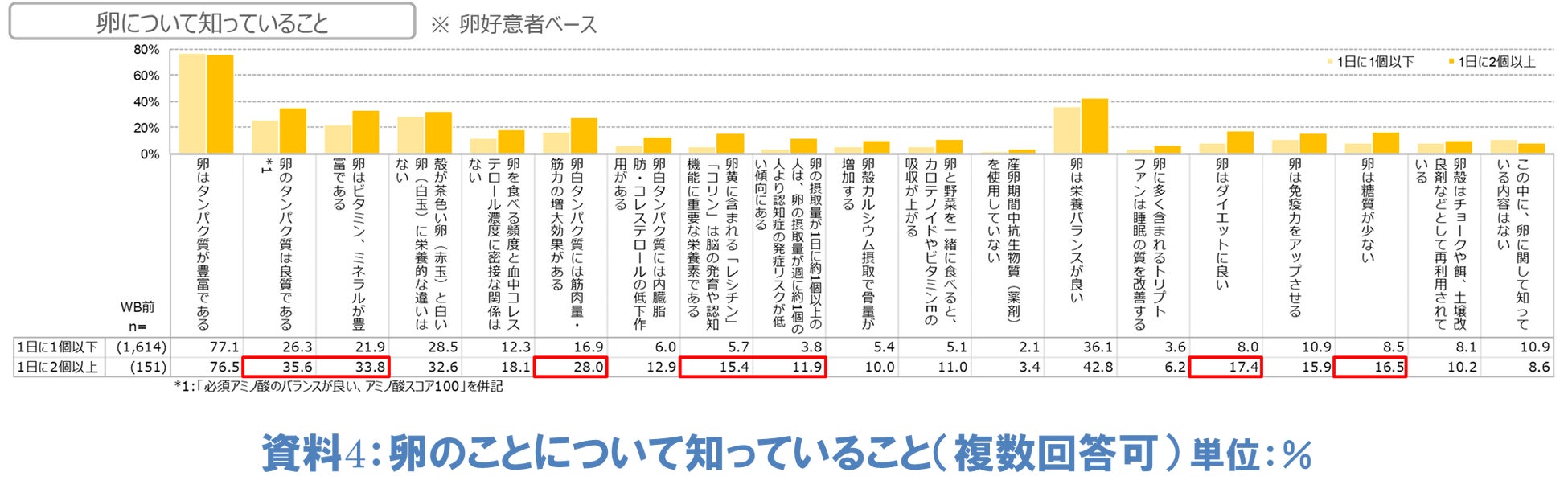 特に「卵のタンパク質は良質である」「卵はビタミン、ミネラルが豊富である」「卵白タンパク質は筋肉量、筋力の増大効果がある」は、卵を1日2個以上食べている人がそうではない人に比べて10ポイント以上も高い結果となりました。他にも「卵黄に含まれる『レシチン』『コリン』は脳の発育や認知機能に重要な栄養素である」「卵の摂取量が1日に1個以上の人は、卵の摂取量が週に1個の人より認知症の発症リスクが低い傾向にある」「卵はダイエットに良い」「卵は糖質が少ない」についても8ポイント以上高いことが分かりました。これらのことから、1日に卵を2個以上食べる人は、卵の健康機能への理解が深いことが推察されます(資料4)。