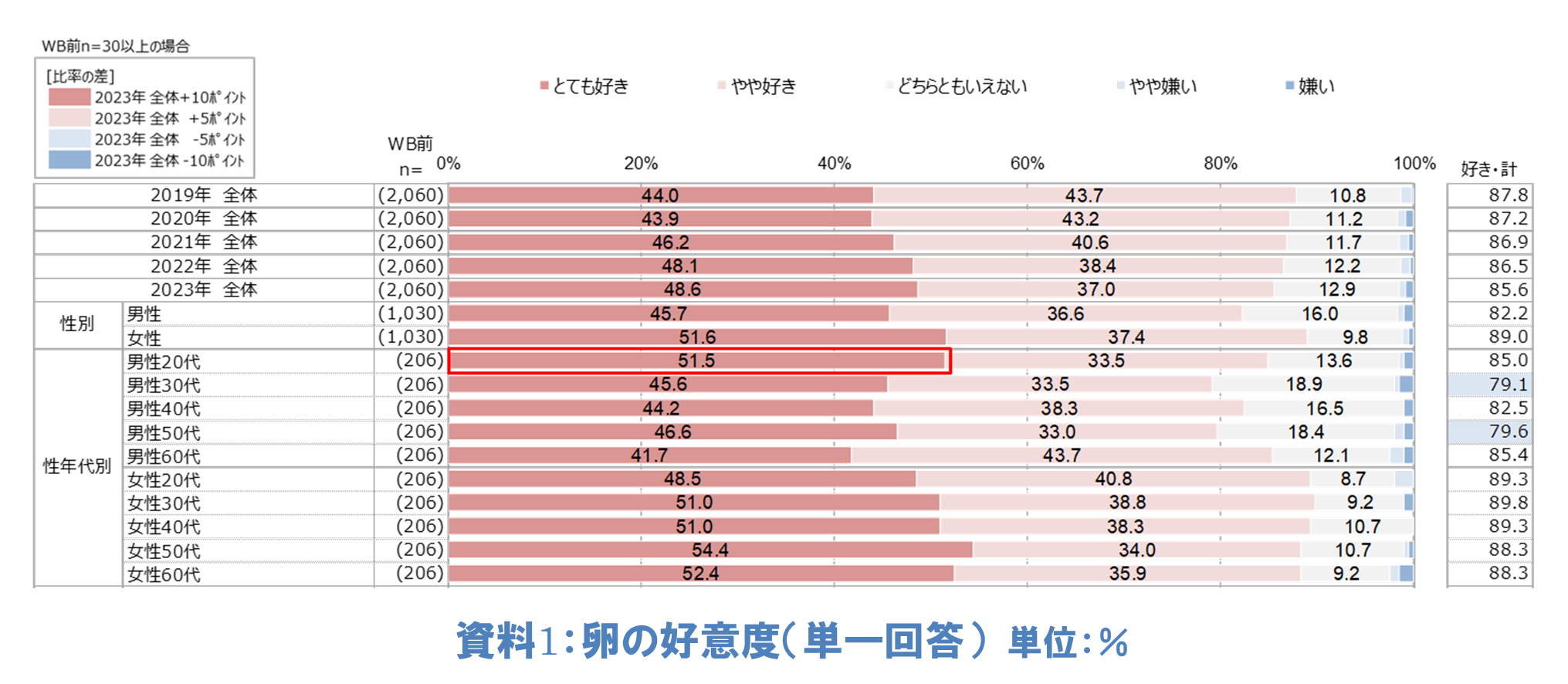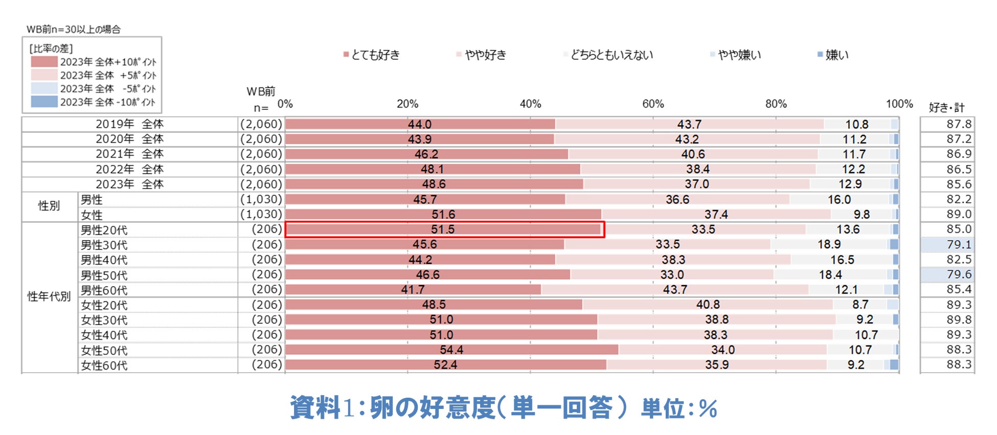 「あなたは卵をどの程度好きですか」と尋ねたところ(単一回答)、「とても好き」と回答した人は、全体の48.6%でした。「やや好き」と合わせると85.6%で前年と同水準の高い割合でした。その中で、男性20代で「とても好き」と回答した人は51.5%で前年の36.9%に比べて14.6ポイントも増加していることが分かりました(資料1)。男性20代の「卵に対するイメージ」については「栄養価が高い」が前年に比べて増加しており、さらに「卵について知っていること」では「卵のタンパク質は良質である」が増加していました。男性20代の卵の栄養価に対するイメージや魅力が高まっていることが示唆されました(資料なし)。