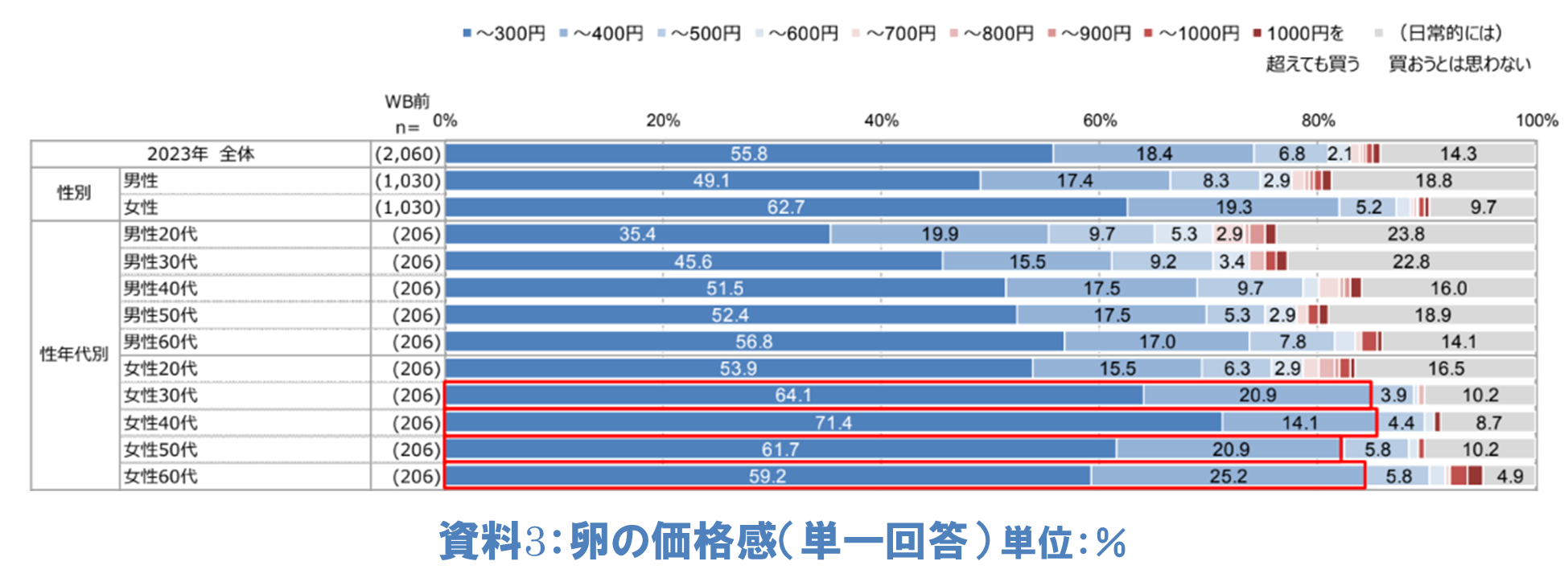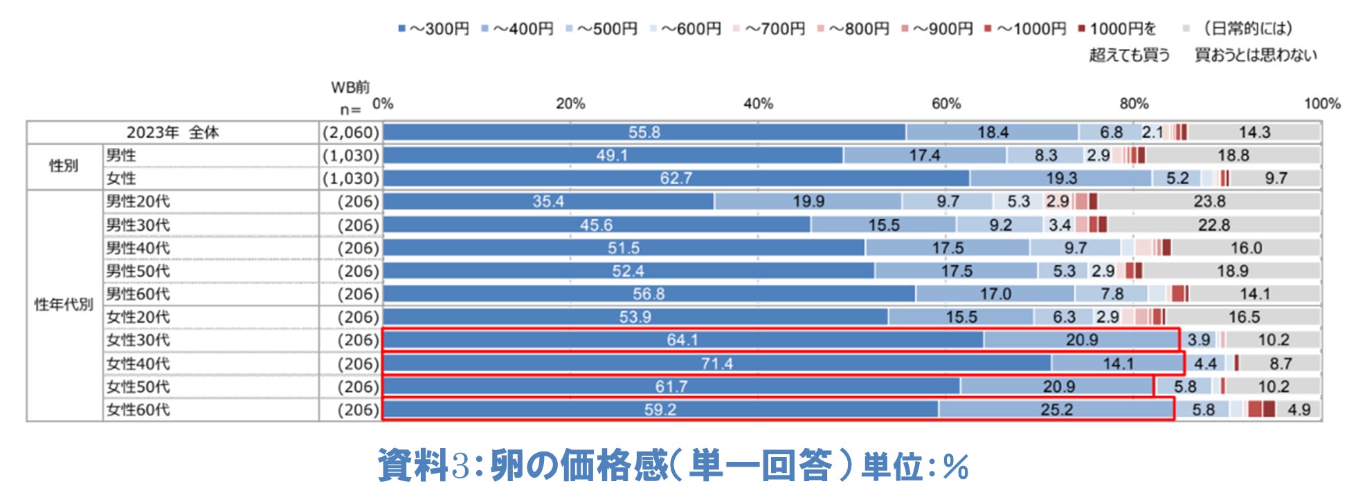 卵が価格変動する中「日常的に使う卵(10個パック)のためにいくらまで支払えますか」と尋ねたところ(単一回答)、全体で55.8%の人が、300円までであれば支払えると回答しています。性年代別でみると1週間で卵の平均購入個数が多い女性30代以上は、他の性年代に比べて300円までと400円までの合計が高く、さらに女性30代、50代、60代においては、400円まで支払えるという人が2割以上いることも分かりました(資料3)。