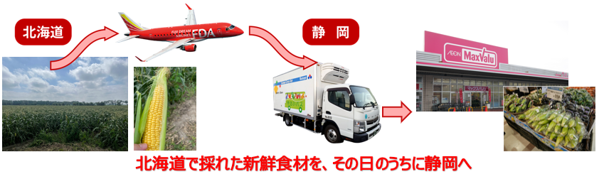 やさいバス株式会社(静岡県牧之原市、代表取締役社⻑:加藤百合⼦、以下やさいバス)、株式会社フジドリームエアラインズ(静岡県静岡市、代表取締役社長:楠瀬俊一、以下FDA)、マックスバリュ東海株式会社(静岡県浜松市、代表取締役社長:作道政昭、以下マックスバリュ東海)、及び北海道コカ・コーラボトリング株式会社(北海道札幌市、代表取締役社長:佐々木康行、以下北海道コカ・コーラ)は共同で、北海道の豊富な食材を、FDAの定期路線便にて旅客の手荷物サービスを活用することで静岡県にお届けする事業を実施します。