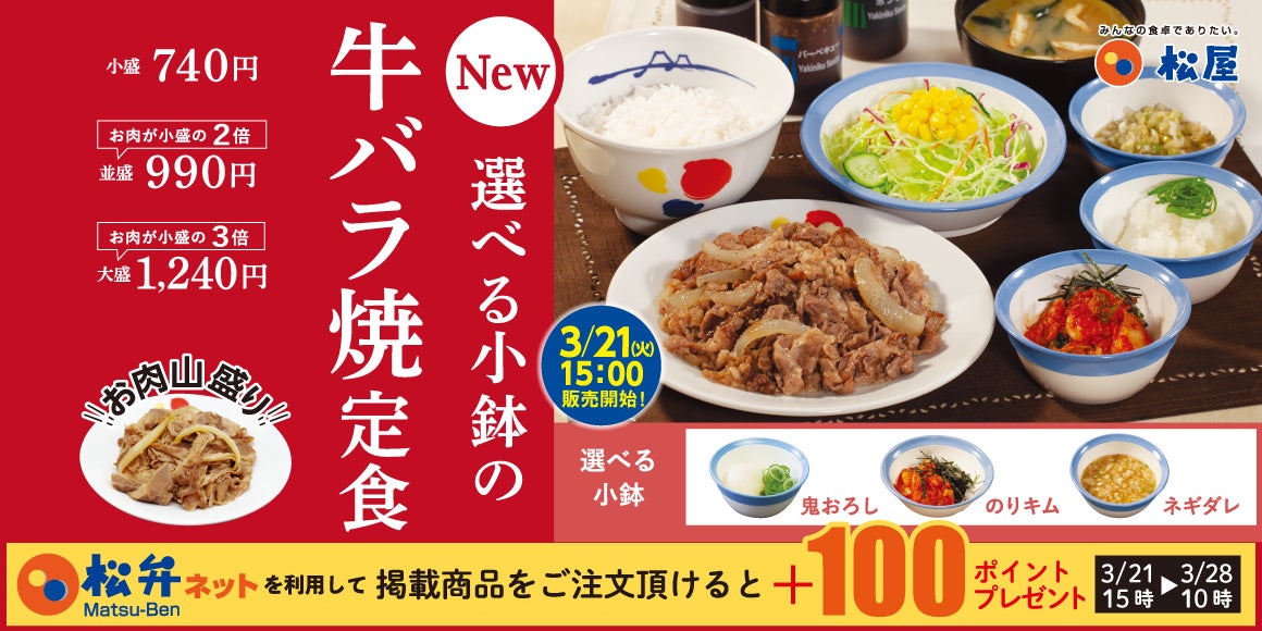 3月21日15時~3月28日10時まで、松弁ネットを利用して「牛バラ焼定食」関連商品をご注文頂けると、100ポイントプレゼントいたします。