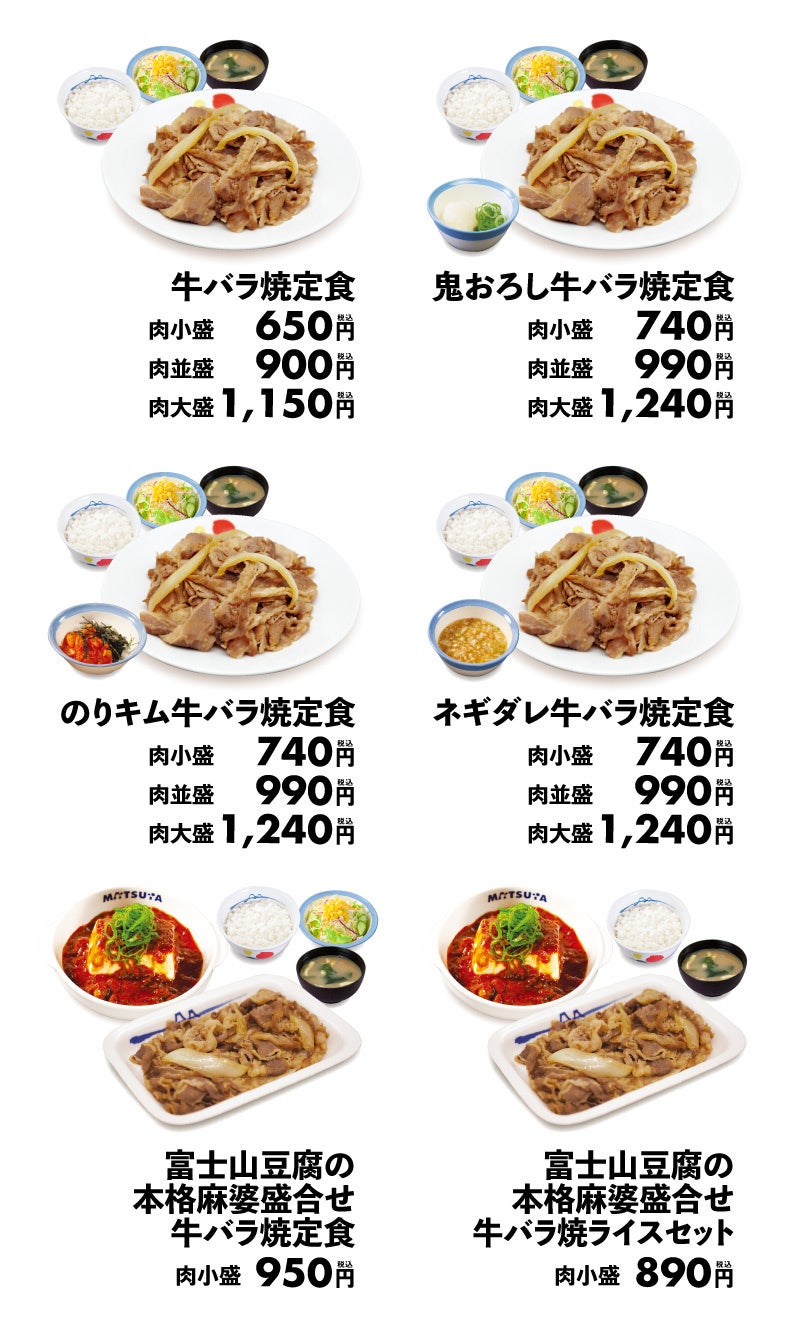 | 商品名   牛バラ焼定食肉小盛                        650円 牛バラ焼定食肉並盛 900円 牛バラ焼定食肉大盛 1,150円 鬼おろし牛バラ焼定食肉小盛 740円 鬼おろし牛バラ焼定食肉並盛 990円 鬼おろし牛バラ焼定食肉大盛 1,240円 のりキム牛バラ焼定食肉小盛 740円 のりキム牛バラ焼定食肉並盛 990円 のりキム牛バラ焼定食肉大盛 1,240円 ネギダレ牛バラ焼定食肉小盛 740円 ネギダレ牛バラ焼定食肉並盛 990円 ネギダレ牛バラ焼定食肉大盛 1,240円 富士山豆腐の本格麻婆盛合せ牛バラ焼定食肉小盛 950円 富士山豆腐の本格麻婆盛合せ牛バラ焼ライスセット肉小盛 890円 ※お持ち帰りいただけます。お持ち帰りにみそ汁は付きません。 お持ち帰りの場合、みそ汁は別途60円でお求めいただけます。 ※税込み価格です。 発売日 2023年3月21日(火)午後3時 ~ 対象店舗 一部店舗を除く全国の松屋 |