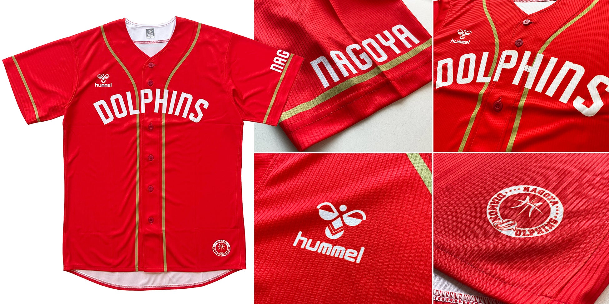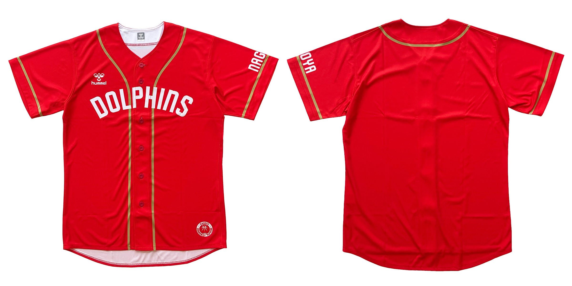 ベースボールシャツのデザインは、今シーズンのHOMEユニフォームをベースに、胸に「DOLPHINS」とシンプルに入れ、エンブレムはあえて裾部に小さく配置。厚みのあるしっかりとした生地を採用。ドルフィンズレッドにゴールドのパイピングで、名古屋らしさを主張する一枚に仕上げました。