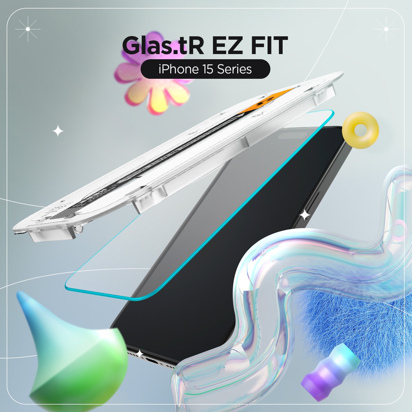 「iPhone 15 Series」専用のガラスフィルム【Glas.tR EZ Fit】は、誰でも簡単に貼り付けできる特徴を持つSpigenを代表するガラスフィルムです。
