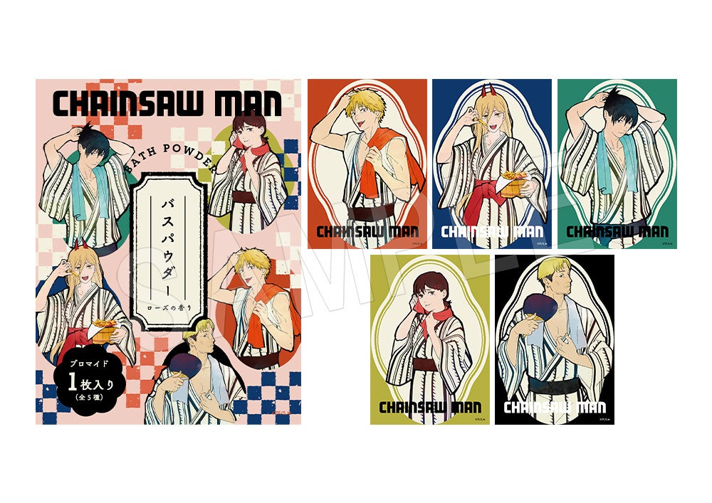 デンジたち5人の湯上り姿の新規描き下ろしイラストを使用した「アクリルスタンド」や「ブロマイド付きバスパウダー」などの新作グッズが多数登場!