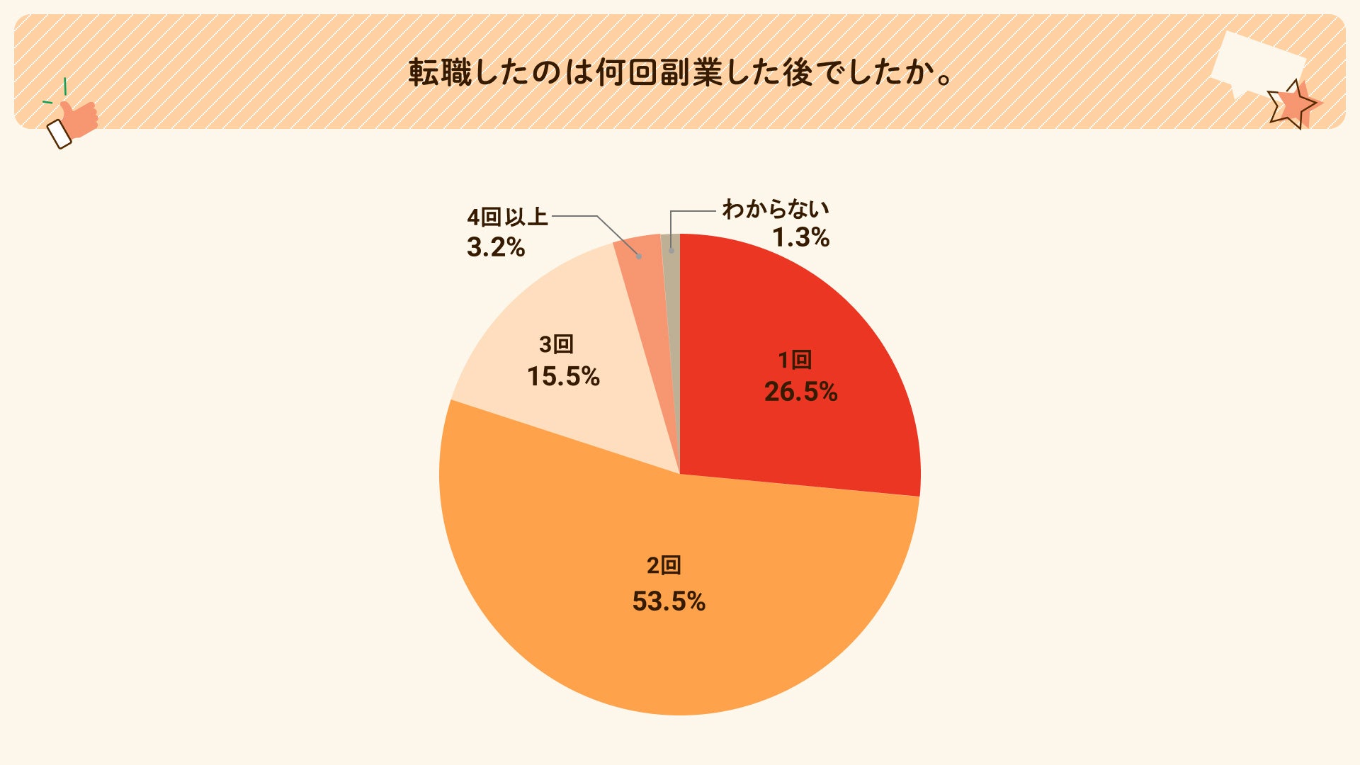 副業経験者に、副業がきっかけとなって、転職をしたことがあるか尋ねたところ、「ある」との回答が41.1%、「ない」との回答が57.0%でした。また、「ある」と答えた回答者に、転職は何回副業した後か尋ねたところ、「1回目」との回答が26.5%、「2回目」との回答が53.5%、「3回目」との回答が15.5%、「4回以上」との回答が3.2%という結果になりました。