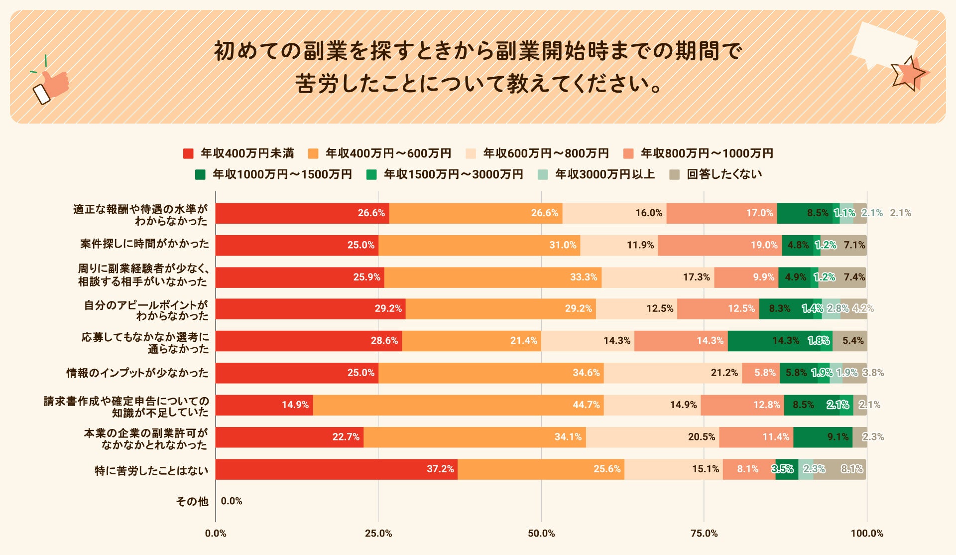 また年収別でみると、400万円未満では「特に苦労したことはない」(37.2%)に次いで、「自分のアピールポイントが分からなかった」(29.2%)、400万円以上~600万円未満では「請求書作成や確定申告についての知識が不足していた」(44.7%)、600万円以上~800万円未満では「情報のインプットが少なかった」(21.2%)、800万円以上~1,000万円未満では「案件を探すのに時間がかかった」(19.0%)、1,000万円以上~1,500万円未満では「応募してもなかなか選考が通らなかった」(14.3%)が、案件探しから実施までで苦労したことの最多になりました。