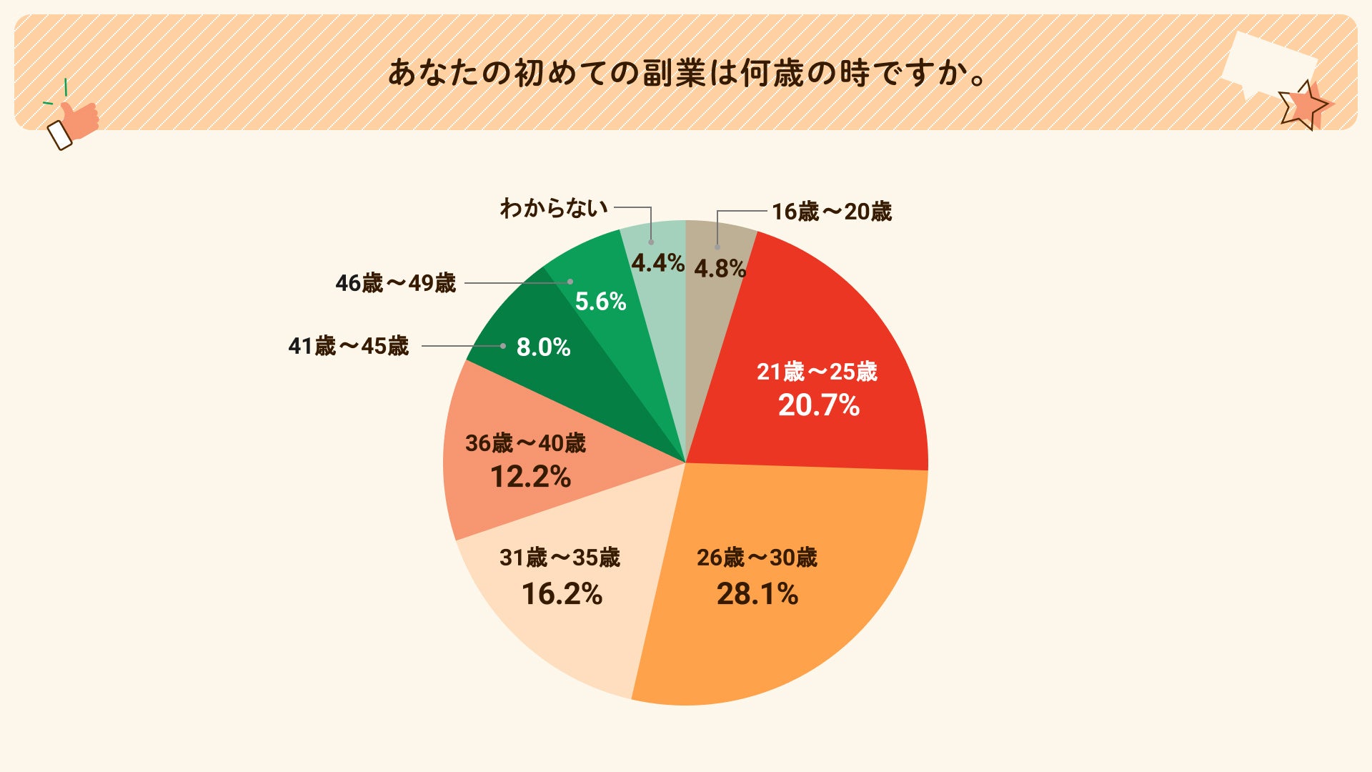副業経験者に、初めて副業を実施した年齢について尋ねたところ、「26~30歳」との回答が28.1%、「21~25歳」との回答が20.7%、「31~35歳」との回答が16.2%という結果になりました。