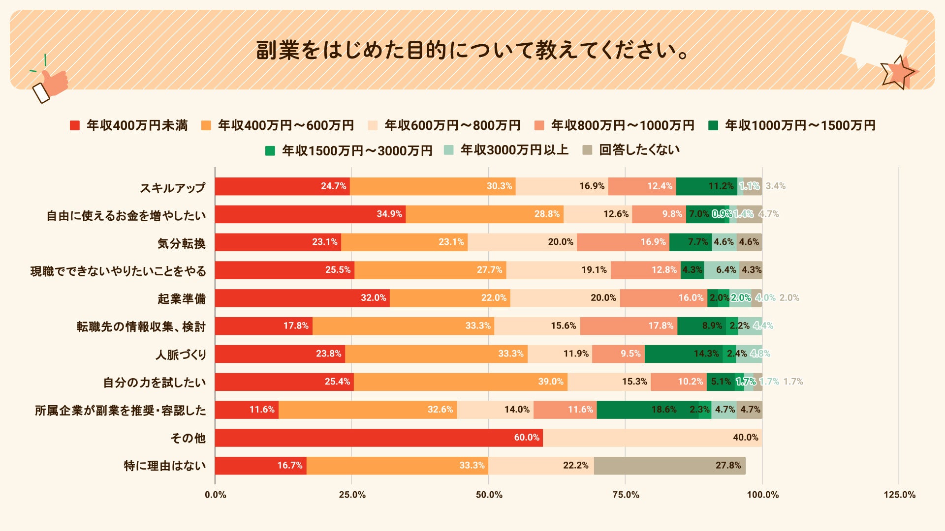 また年収別での目的をみると、400万円未満では「自由に使えるお金を増やしたい」(34.9%)、400万円以上~600万円未満では「自分の力を試したい」(39.0%)、600万円以上~800万円未満では同率で「気分転換」「起業準備」(20.0%)、800万円以上~1,000万円未満では「転職先の情報収集、検討」(17.8%)、1,000万円以上~1,500万円未満では「所属企業が副業を推奨・容認した」(18.6%)が最多になりました。年収が上がるにつれ、新たなチャレンジやキャリア開拓を目的にしていることが伺えます。