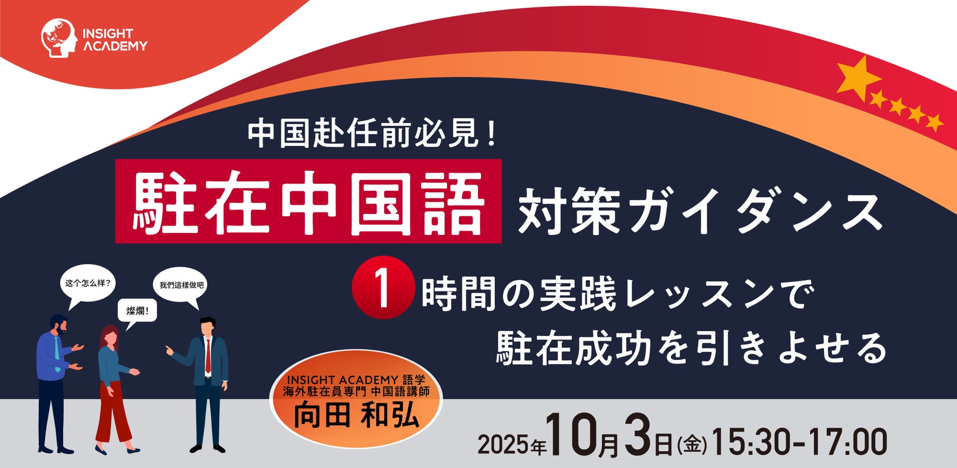 グローバル⼈材育成・研修業を⼿掛けるインサイトアカデミー株式会社(本社:東京都港区新橋、代表:金 珍燮)は、無料webセミナー「【中国赴任前必見!】”駐在中国語” 対策ガイダンス~1時間の実践レッスンで、駐在成功を引きよせる~」を開催致します。