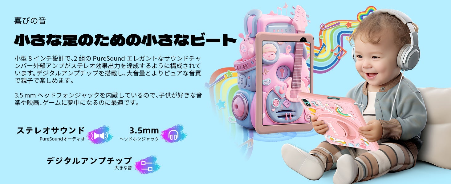 小型8インチ設計で、2組のPureSoundエレガントなサウンドチャンバー外部アンプがステレオ効果出力を達成するように構成されています。デジタルアンプチップを搭載し、大音量とよりピュアな音質で親子で楽しめます。3.5 mmヘッドフォンジャックを内蔵しているので、子供が好きな音楽や映画、ゲームに夢中になるのに最適です。
