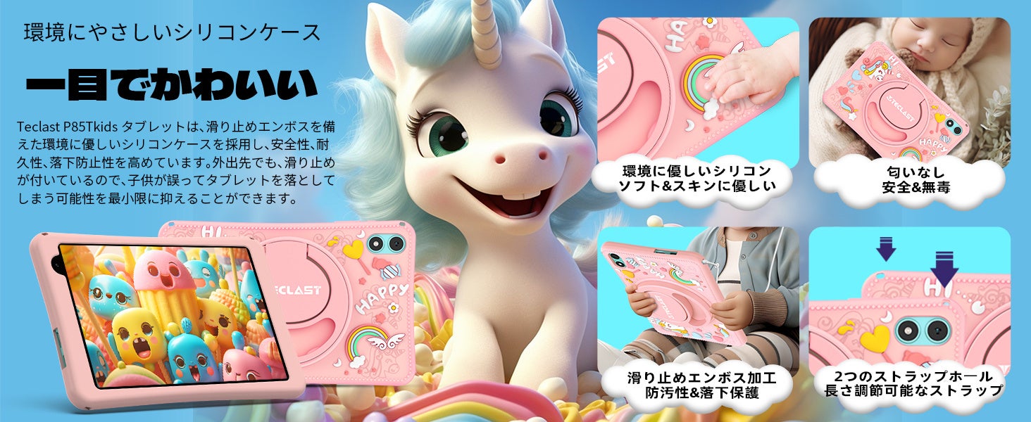 Teclast「P85Tkids」は、滑り止めエンボスを備えた環境に優しいシリコンケースを採用し、安全性、耐久性、落下防止性を高めています。外出先でも、滑り止めが付いているので、落としてしまう可能性を最小限に抑えることができます。特許取得済みのスタンドデザインを採用して、360°回転設計で様々なシーンに対応。