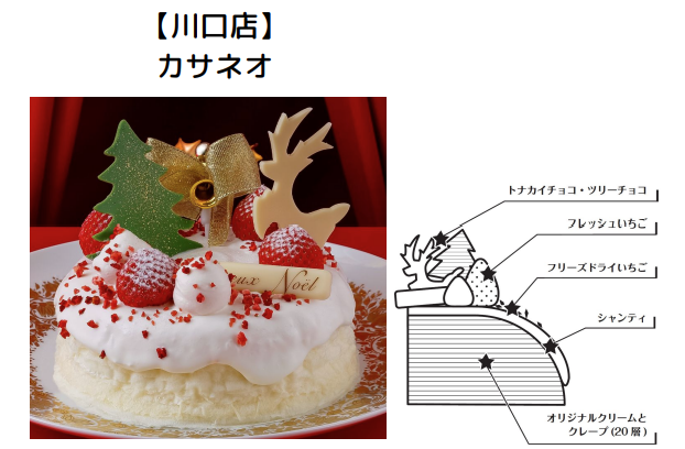 ・商品名:ミルクレープホワイトクリスマス12㎝ ・商品説明:真っ白なクレープ皮を使い、まるでショートケーキのようなミルクレープをクリスマス仕様に仕上げました。
