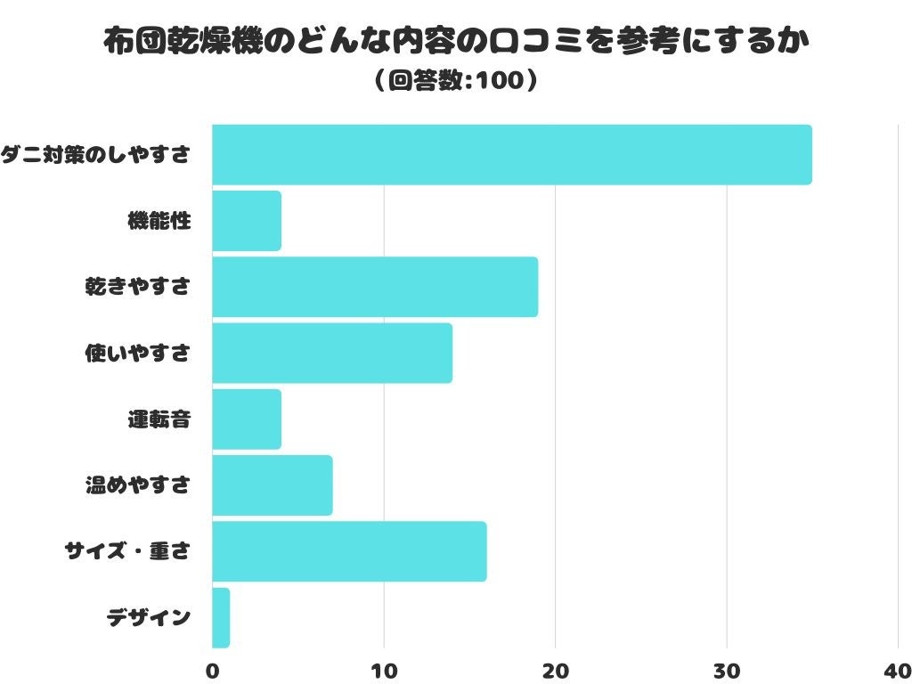 布団乾燥機のどんな内容の口コミを参考にするかをアンケートにて調査したところ、1位は「ダニ対策のしやすさ」でした。