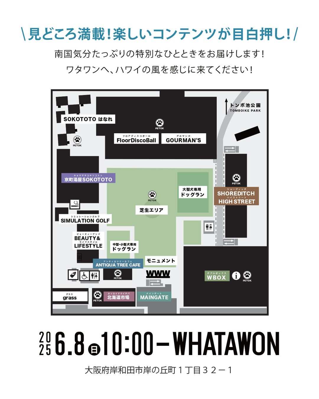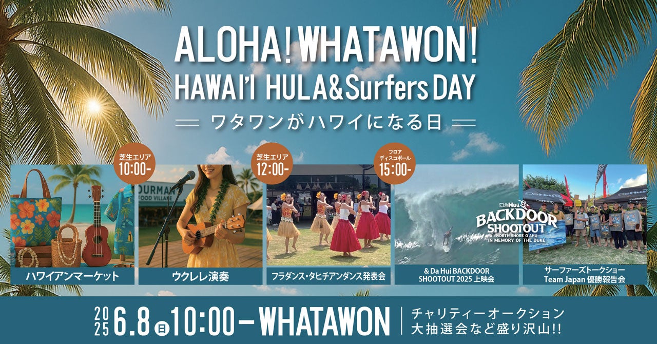 大阪・岸和田の滞在型エンターテインメントモール「WHATAWON(ワタワン)」では、2025年6月8日(日)、南国ハワイをテーマにした特別イベント『ALOHA!WHATAWON! HULA&Surfers DAY』を開催します。