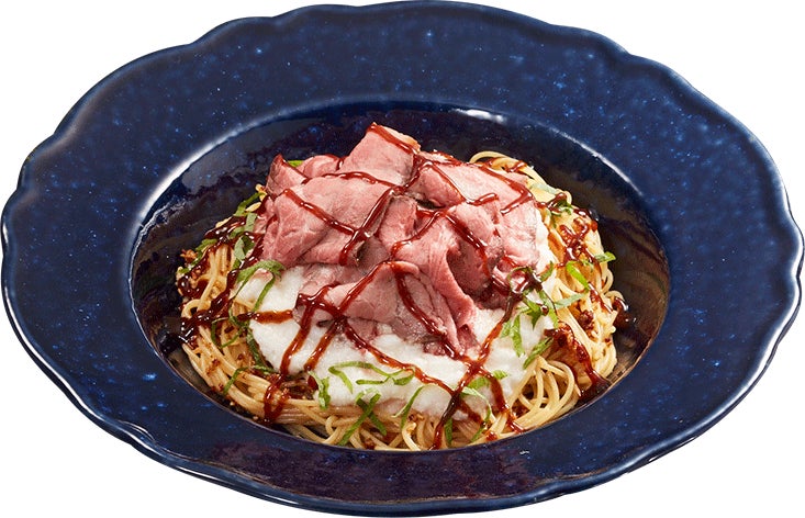 「“冷製カッペリーニ” ローストビーフとグリーンアスパラ・半熟卵の醤油ソース」は、豪快にのせたローストビーフ、フレッシュなグリーンアスパラ、とろ~り半熟卵をご堪能いただける一品です。ガーリック香る和風パスタの、やみつきになる味わいをお楽しみください。同時に、とろろでさっぱりとお召し上がりいただける「“冷製カッペリーニ” ローストビーフのとろろ和風」も販売します。