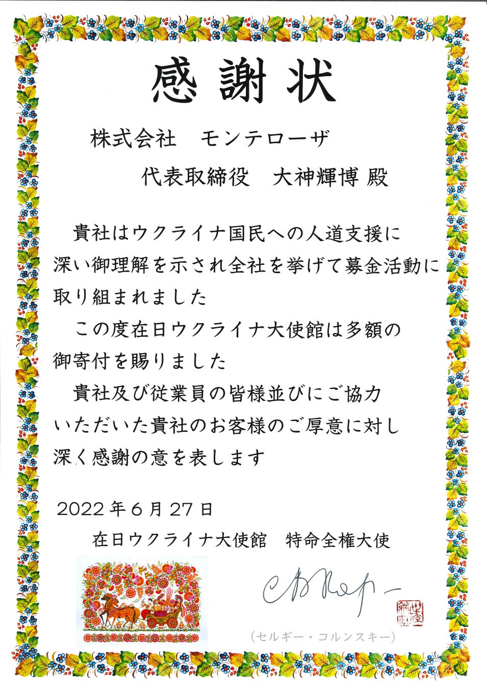 なお、今回の寄付に対し、在日ウクライナ大使館の特命全権大使セルギー・コルンスキー閣下から「感謝状」を拝受しましたので、あわせてご報告申し上げます。