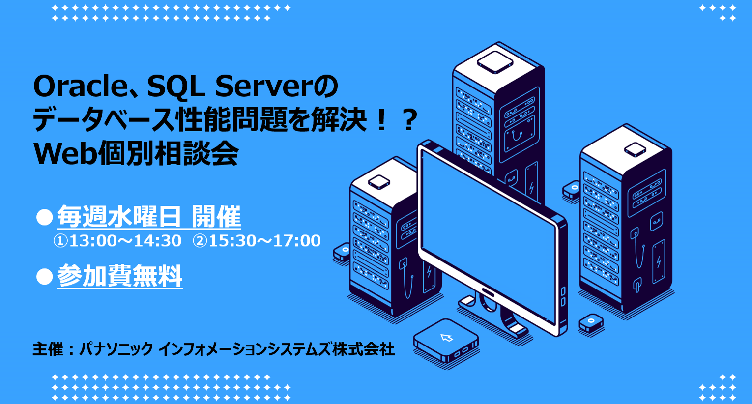 パナソニック インフォメーションシステムズ株式会社は、2022年7月6日(水)から9月28日(水)にかけて各回1社限定の、データベース性能問題にフォーカスしたWeb個別相談会を開催します。※好評につき期間延長しました。