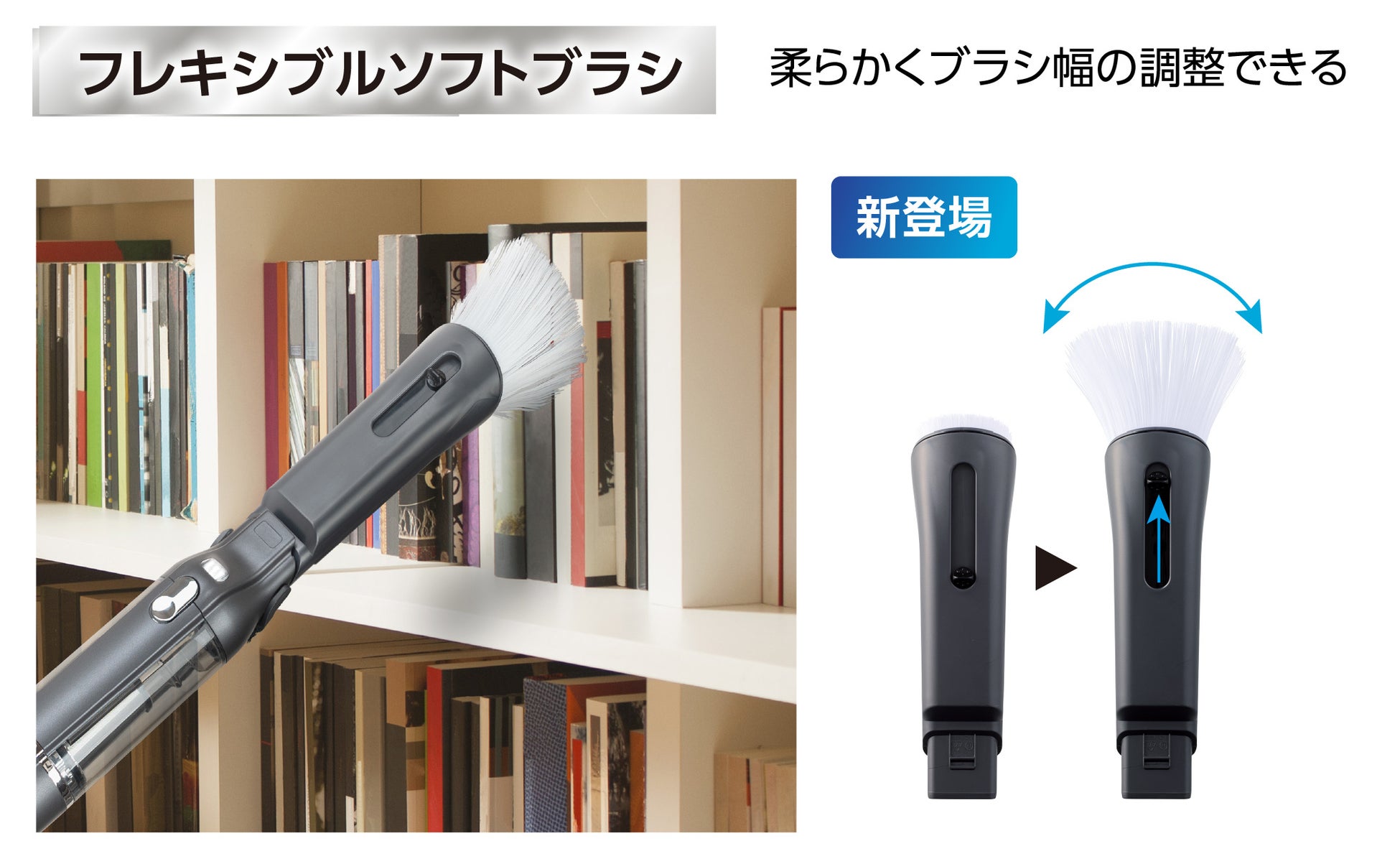 お掃除場所に合わせてブラシの幅が調整でき、デリケートな場所などに最適な柔らかい <フレキシブルソフトブラシ>