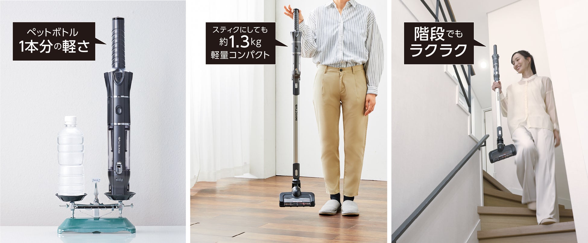 ワンタッチでハンディからスティック掃除機に早変わり。スティック時も約1.3kgなので、片手でも軽々持ち上がり、階段の登り降りもラクラクです。